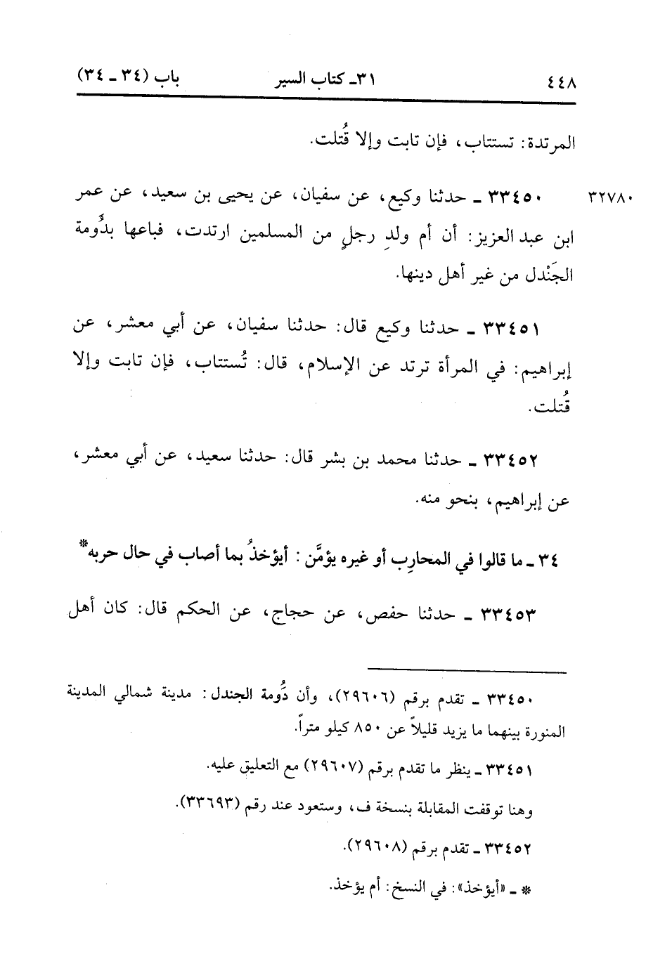 33450- حَدَّثَنَا وَكِيعٌ ، عَنْ سُفْيَانَ ، عَنْ يَحْيَى بْنِ سَعِيدٍ ، عَنْ عُمَرَ بْنِ عَبْدِ الْعَزِيزِ أَنَّ أُمَّ وَلَدِ رَجُلٍ مِنَ الْمُسْلِمِينَ ارْتَدَّتْ , فَبَاعَهَا بِدَوْمَةِ الْجَنْدَلِ مِنْ غَيْرِ أَهْلِ دِينِهَا.