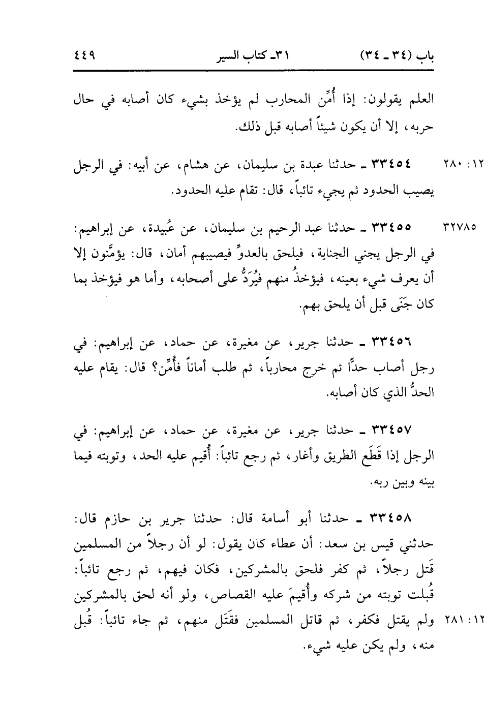 33455- حَدَّثَنَا عَبْدُ الرَّحِيمِ بْنُ سُلَيْمَانَ ، عَنْ عُبَيْدَةَ ، عَنْ إبْرَاهِيمَ ؛ فِي الرَّجُلِ يَجْنِي الْجِنَايَةَ فَيَلْحَقُ بِالْعَدُوِّ فَيُصِيبُهُمْ أَمَانٌ ، قَالَ : يُؤَمَّنُونَ إِلاَّ أَنْ يُعْرَفَ شَيْءٌ بِعَيْنِهِ فَيُؤْخَذُ مِنْهُمْ , فَيُرَدُّ عَلَى أَصْحَابِهِ , وَأَمَّا هُوَ فَيُؤْخَذُ بِمَا كَانَ جَنَى قَبْلَ أَنْ يَلْحَقَ بِهِمْ.