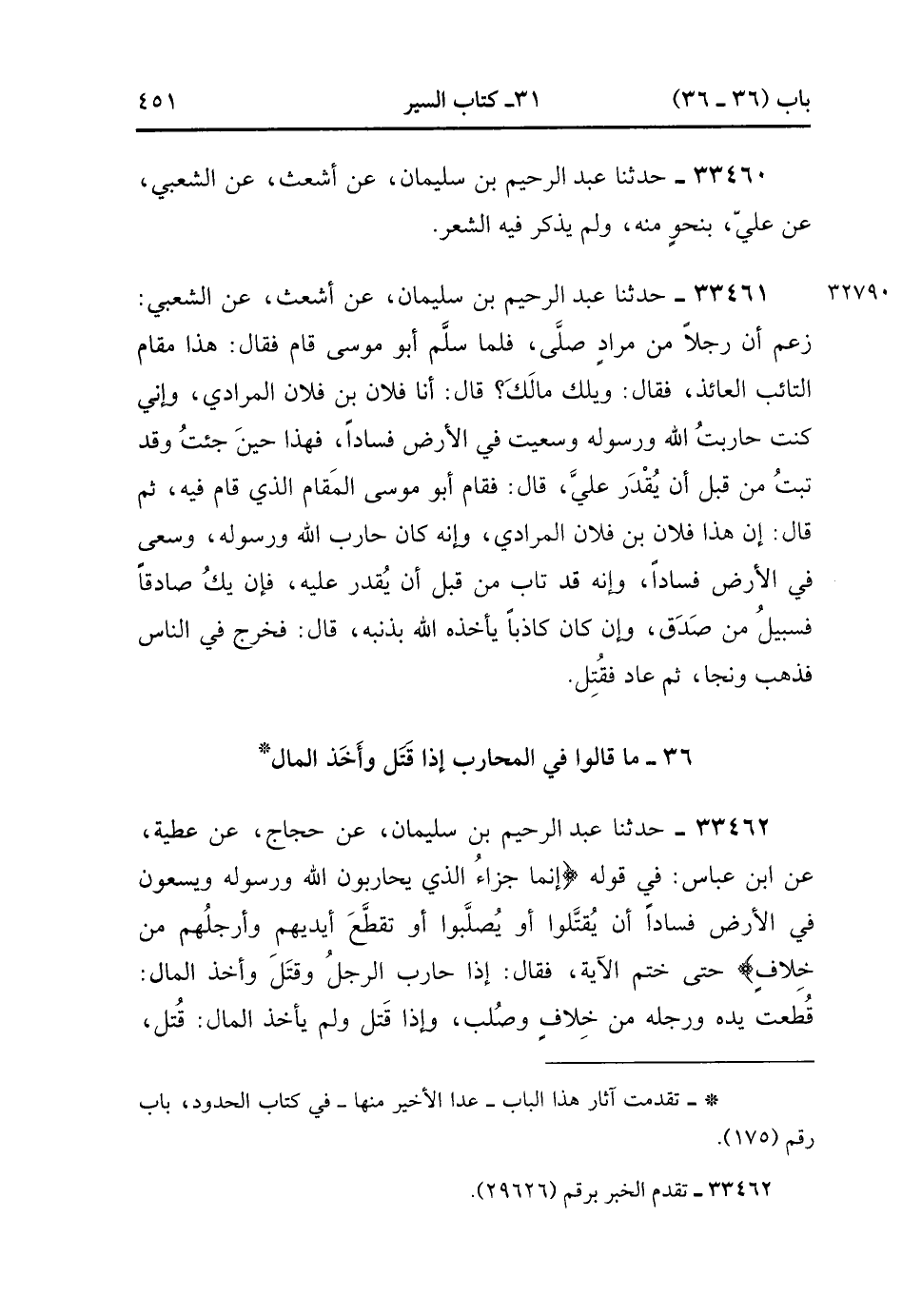 33461- حَدَّثَنَا عَبْدُ الرَّحِيمِ بْنُ سُلَيْمَانَ ، عَنْ أَشْعَثَ ، عَنِ الشَّعْبِيِّ زَعَمَ أَنَّ رَجُلاً مِنْ مُرَادٍ صلَّى ، فَلَمَّا سَلَّمَ أَبُو مُوسَى قَامَ ، فَقَالَ : هَذَا مَقَامُ التَّائِبِ الْعَائِذِ ، فَقَالَ : وَيْلَك مَا لَكَ ، قَالَ : أَنَا فُلاَنُ بْنُ فُلاَنٍ الْمُرَادِي , وَإِنِّي كُنْتُ حَارَبْت اللَّهَ وَرَسُولَهُ وَسَعَيْت فِي الأَرْضِ فَسَادًا , فَهَذَا حِينَ جِئْت وَقَدْ تُبْت مِنْ قَبْلِ أَنْ يُقْدَرَ عَلَيَّ ، قَالَ : فَقَامَ أَبُو مُوسَى الْمَقَامَ الَّذِي قَامَ فِيهِ ، ثُمَّ قَالَ : إنَّ هَذَا فُلاَنُ بْنُ فُلاَنٍ الْمُرَادِيُّ : وَإِنَّهُ كَانَ حَارَبَ اللَّهَ وَرَسُولَهُ وَسَعَى فِي الأَرْضِ فَسَادًا , وَإِنَّهُ قَدْ تَابَ مِنْ قَبْلِ أَنْ يُقْدَرَ عَلَيْهِ , فَإِنْ يَكُ صَادِقًا فَسَبِيلُ مَنْ صَدَقَ ، وَإِنْ كَانَ كَاذِبًا يَأْخُذُهُ اللَّهُ بِذَنْبِهِ ، قَالَ : فَخَرَجَ فِي النَّاسِ فَذَهَبَ ونجا ، ثُمَّ عَادَ فَقُتِلَ. (12/282).