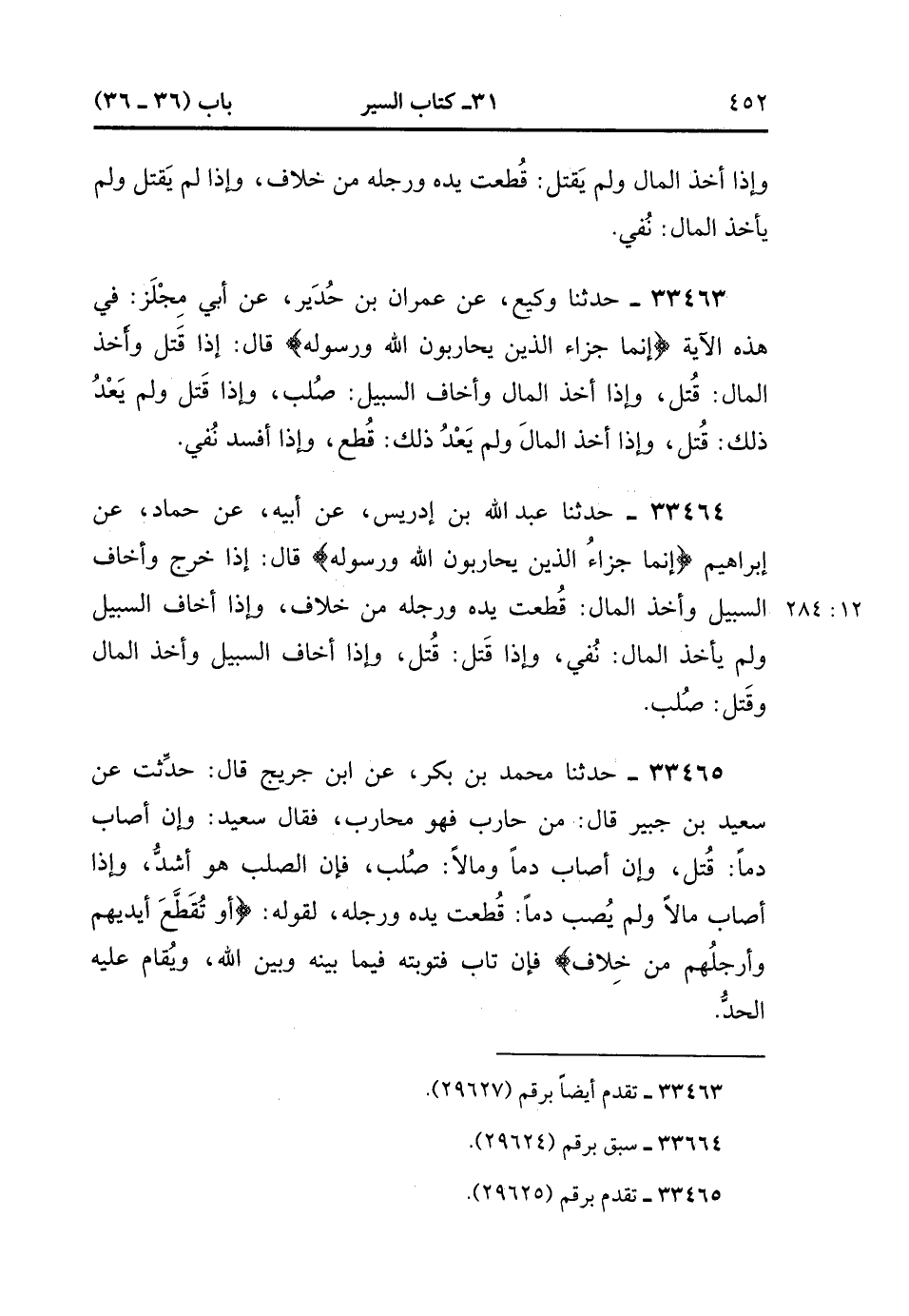 33464- حَدَّثَنَا عَبْدُ اللهِ بْنُ إدْرِيسَ ، عَنْ أَبِيهِ ، عَنْ حَمَّادٍ ، عَنْ إبْرَاهِيمَ : {إنَّمَا جَزَاءُ الَّذِينَ يُحَارِبُونَ اللَّهَ وَرَسُولَهُ} قَالَ : إذَا خَرَجَ وَأَخَافَ السَّبِيلَ وَأَخَذَ الْمَالَ قُطِعَتْ يَدُهُ وَرِجْلُهُ مِنْ خِلاَفٍ , وَإِذَا أَخَافَ السَّبِيلَ وَلَمْ يَأْخُذَ الْمَالَ نُفِي , وَإِذَا قَتَلَ قُتِلَ , وَإِذَا أَخَافَ السَّبِيلَ وَأَخَذَ الْمَالَ وَقَتَلَ صُلِبَ. (12/283).
