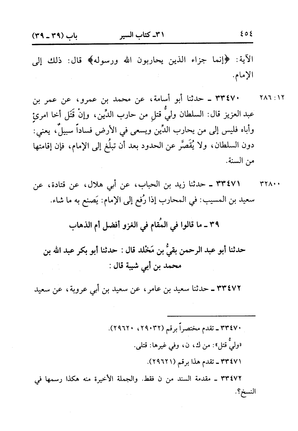 33470- حَدَّثَنَا أَبُو أُسَامَةَ ، عَنْ مُحَمَّدِ بْنِ عَمْرٍو ، عَنْ عُمَرَ بْنِ عَبْدِ الْعَزِيزِ ، قَالَ : السُّلْطَانُ وَلِيٌّ قَتْلِ مَنْ حَارَبَ الدِّينَ وَإِنْ قَتَلَ أَخَا امْرِئٍ وَأَبَاهُ , فَلَيْسَ إلَى مَنْ يُحَارِبُ الدِّينَ وَيَسْعَى فِي الأَرْضِ فَسَادًا سَبِيلٌ ، يَعْنِي دُونَ السُّلْطَانِ , وَلاَ يُقَصَّرْ عَنِ الْحُدُودِ بَعْدَ أَنْ تَبْلُغَ إلَى الإِمَامِ , فَإِنَّ إقَامَتَهَا مِنَ السُّنَّةِ. (12/285).