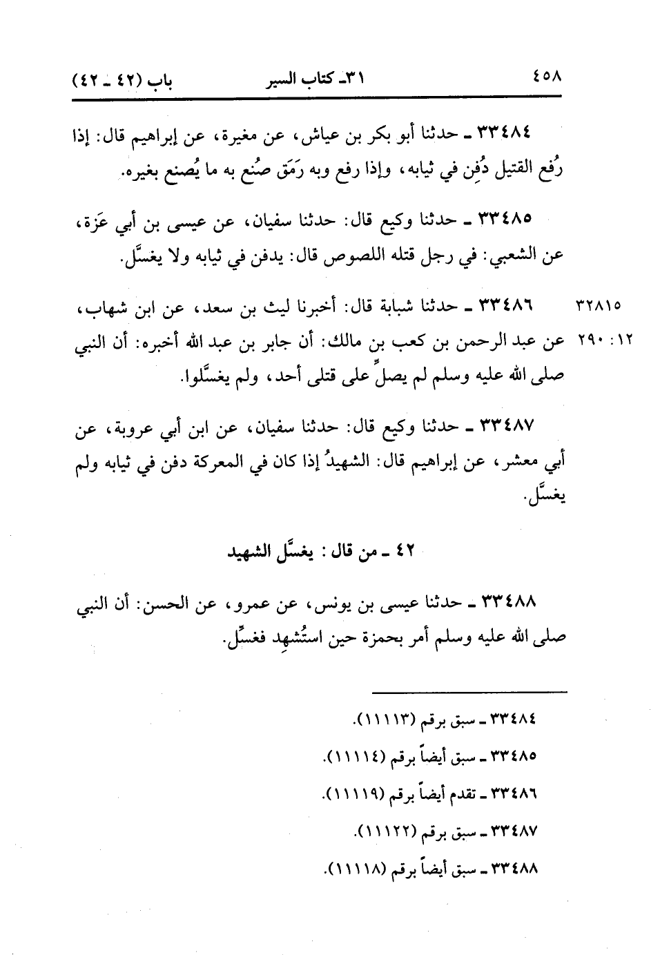 33486- حَدَّثَنَا شَبَابَةُ ، قَالَ : أَخْبَرَنا لَيْثُ بْنُ سَعْدٍ ، عَنِ ابْنِ شِهَابٍ ، عَنْ عَبْدِ الرَّحْمَنِ بْنِ كَعْبِ بْنِ مَالِكٍ أَنَّ جَابِرَ بْنَ عَبْدِ اللهِ أَخْبَرَهُ أَنَّ النَّبِيَّ صَلَّى الله عَلَيْهِ وَسَلَّمَ لَمْ يُصَلِّ عَلَى قَتْلَى أُحُدٍ وَلَمْ يُغَسَّلُوا.