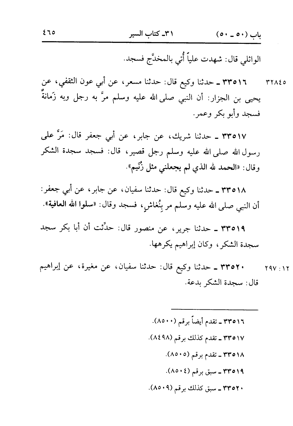 33519- حَدَّثَنَا جَرِيرٌ ، عَنْ مَنْصُورٍ ، قَالَ : حَدَّثْت أَنَّ أَبَا بَكْرٍ سَجَدَ سَجْدَةَ الشُّكْرِ , وَكَانَ إبْرَاهِيمُ يَكْرَهُهَا. (12/296).