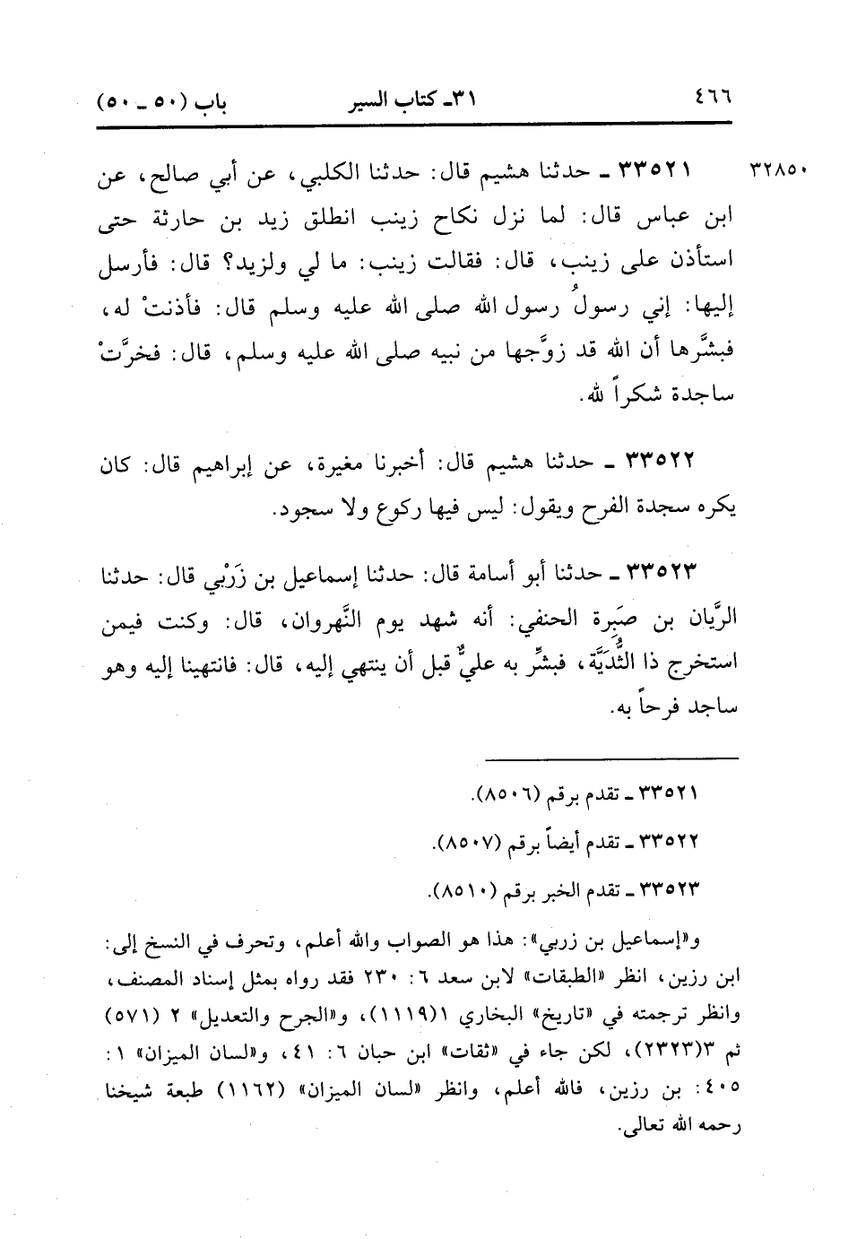 33521- حَدَّثَنَا هُشَيْمٌ , قَالَ : حدَّثَنَا الْكَلْبِيُّ ، عَنْ أَبِي صَالِحٍ ، عَنِ ابْنِ عَبَّاسٍ ، قَالَ : لَمَّا نَزَلَ نِكَاحُ زَيْنَبَ انْطَلَقَ زَيْدُ بْنُ حَارِثَةَ حَتَّى اسْتَأْذَنَ عَلَى زَيْنَبَ ، قَالَ : فَقَالَتْ زَيْنَبُ : مَا لِي وَلِزَيْدٍ ، قَالَ : فَأَرْسَلَ إلَيْهَا إِنِّي رَسُولُ رَسُولِ اللهِ صَلَّى الله عَلَيْهِ وَسَلَّمَ , قَالَ : فَأَذِنَتْ لَهُ فَبَشَّرَهَا أَنَّ اللَّهَ زَوَّجَهَا مِنْ نَبِيِّهِ صَلَّى الله عَلَيْهِ وَسَلَّمَ قَالَ : فَخَرَّتْ سَاجِدَةً شُكْرًا لِلَّهِ.