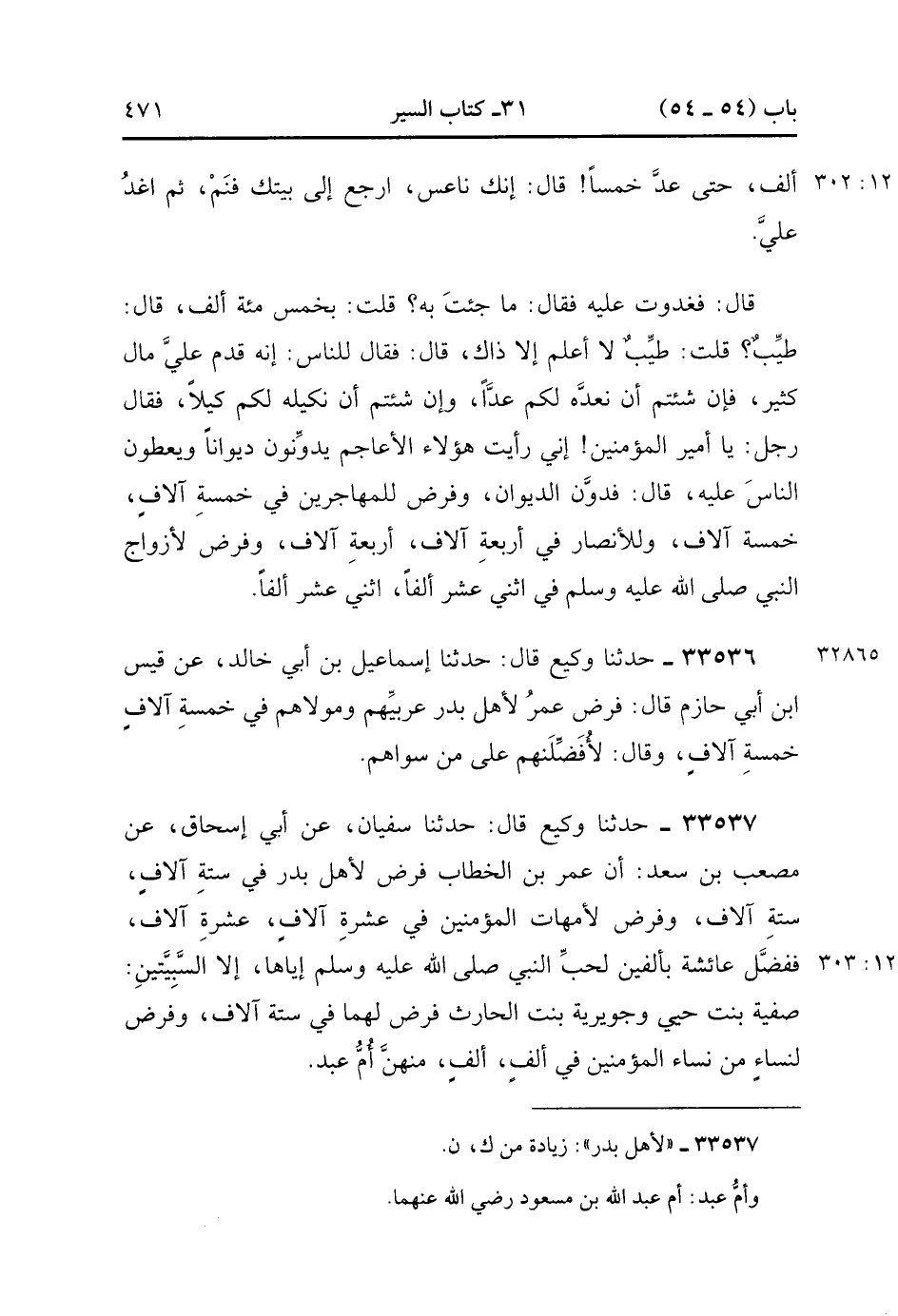 33537- حَدَّثَنَا وَكِيعٌ , قَالَ : حدَّثَنَا سُفْيَانُ ، عَنْ أَبِي إِسْحَاقَ ، عَنْ مُصْعَبِ بْنِ سَعْدٍ أَنَّ عُمَرَ بْنَ الْخَطَّابِ فَرَضَ لأهل بدر فِي سِتَّةِ آلاَفٍ سِتَّةَ آلاَفٍ , وَفَرَضَ لأُمَّهَاتِ الْمُؤْمِنِينَ فِي عَشْرَةِ آلاَفٍ عَشْرَةَ آلاَفٍ , فَفَضَّلَ عَائِشَةَ بِأَلْفَيْنِ لِحُبِّ النَّبِيُّ صَلَّى الله عَلَيْهِ وَسَلَّمَ إيَّاهَا إِلاَّ السَّبِيَّتَيْنِ صَفِيَّةَ بِنْتَ حُيَيٍّ وَجُوَيْرِيَةَ بِنْتَ الْحَارِثِ فَرَضَ لَهما سِتَّةَ آلاَفٍ , وَفَرَضَ لِنِسَاءٍ مِنْ نِسَاءِ الْمُؤْمِنِينَ فِي أَلْفٍ أَلْفٍ مِنْهُمْ أُمُّ عَبْدٍ. (12/302).