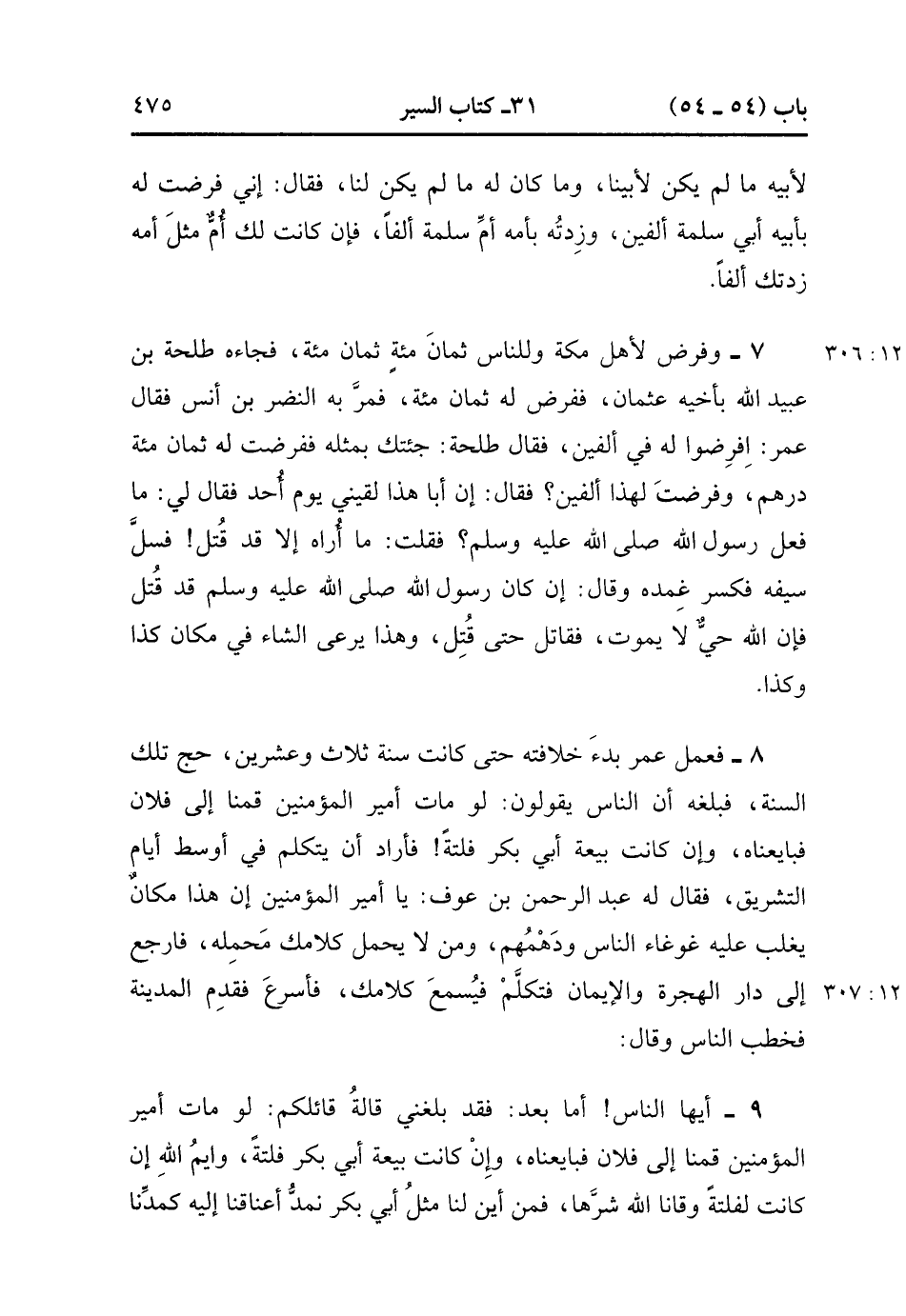 9- أَيُّهَا النَّاسُ , أَمَّا بَعْدُ فَقَدْ بَلَغَنِي قَالَةُ قَائِلُكُمْ : لَوْ مَاتَ أَمِيرُ الْمُؤْمِنِينَ قُمْنَا إلَى فُلاَنٍ فَبَايَعْنَاهُ وَإِنْ كَانَتْ بَيْعَةُ أَبِي بَكْرٍ فَلْتَةً , وَايْمُ اللهِ إِنْ كَانَتْ لَفَلْتَةً وَقَانَا اللَّهُ شَرَّهَا فَمِنْ أَيْنَ لَنَا مِثْلُ أَبِي بَكْرٍ نَمُدُّ أَعْنَاقَنَا إلَيْهِ كَمَدِّنَا إلَى أَبِي بَكْرٍ , إنَّمَا ذَاكَ تَغِرَّةٌ لِيُقْتَلَ , مَنْ انتزع أُمُورِ الْمُسْلِمِينَ مِنْ غَيْرِ مَشُورَةٍ فَلاَ بَيْعَةَ لَهُ. (12/307).