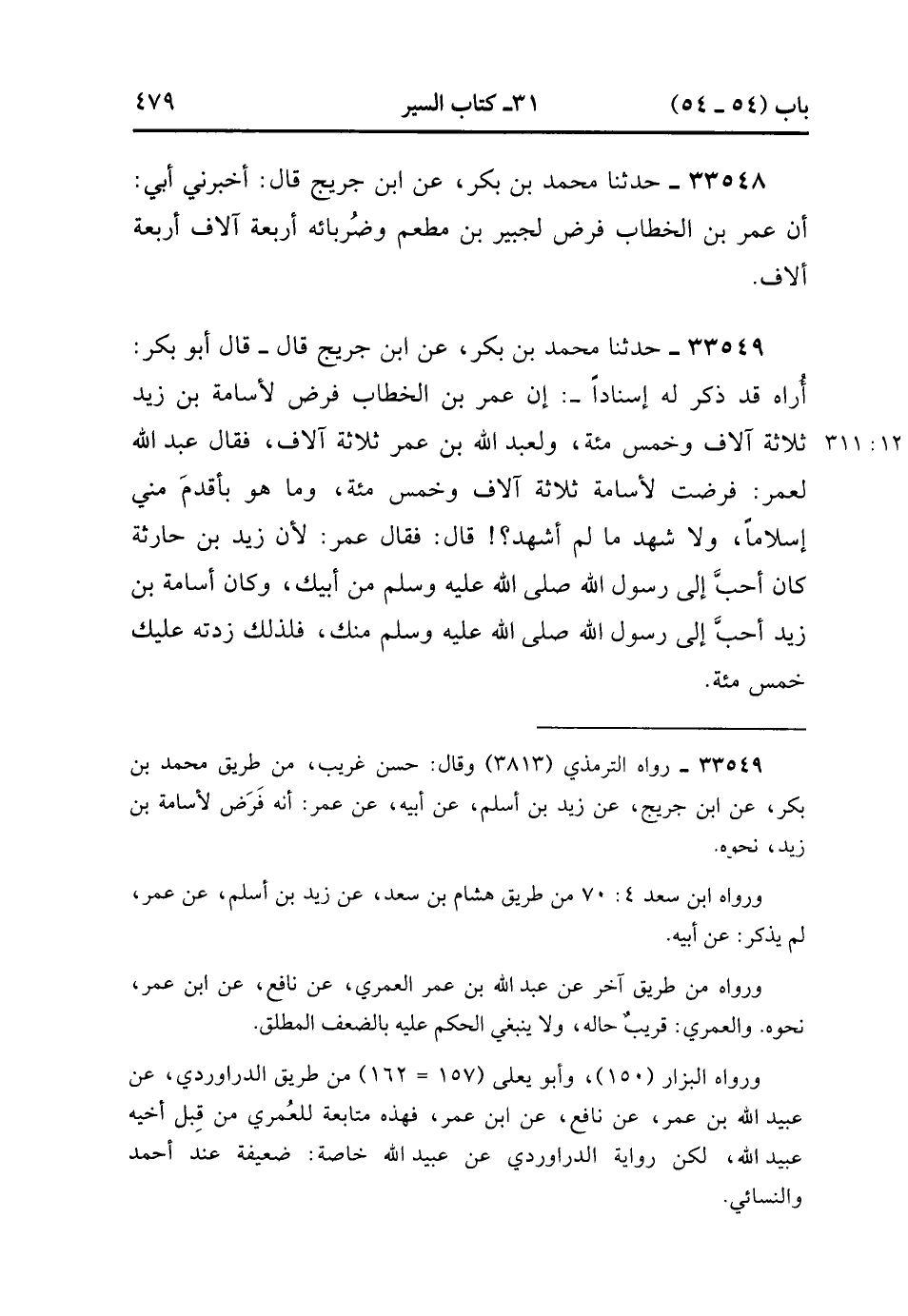 33549- حَدَّثَنَا مُحَمَّدُ بْنُ بَكْرٍ عن ابْنَ جُرَيْجٍ ، قَالَ : قَالَ أَبُو بَكْرٍ : أُرَاهُ قَدْ ذَكَرَ لَهُ إسْنَادًا ؛ أَنَّ عُمَرَ بْنَ الْخَطَّابِ فَرَضَ لأسَامَةَ بْنِ زَيْدٍ ثَلاَثَةَ(12/310) آلاَفٍ وَخَمْسَ مِئَةٍ وَلِعَبْدِ اللهِ بْنِ عُمَرَ ثَلاَثَةَ آلاَفٍ ، فَقَالَ عَبْدُ اللهِ لِعُمَرَ : فَرَضْت لأسَامَةَ ثَلاَثَةَ آلاَفٍ وَخَمْسَ مِئَةٍ ، وَمَا هُوَ بِأَقْدَمَ مِنِّي إسْلاَمًا ، وَلاَ شَهِدَ مَا لَمْ أَشْهَدْ ، قَالَ : فَقَالَ : عُمَرُ : لأَنَّ زَيْدَ بْنَ حَارِثَةَ كَانَ أَحَبَّ إلَى رَسُولِ اللهِ صَلَّى الله عَلَيْهِ وَسَلَّمَ مِنْ أَبِيك وَكَانَ أُسَامَةُ بْنُ زَيْدٍ أَحَبَّ إلَى رَسُولِ اللهِ صَلَّى الله عَلَيْهِ وَسَلَّمَ مِنْك فَلِذَلِكَ زِدْته عَلَيْك خَمْسَ مِئَةٍ. (12/311).