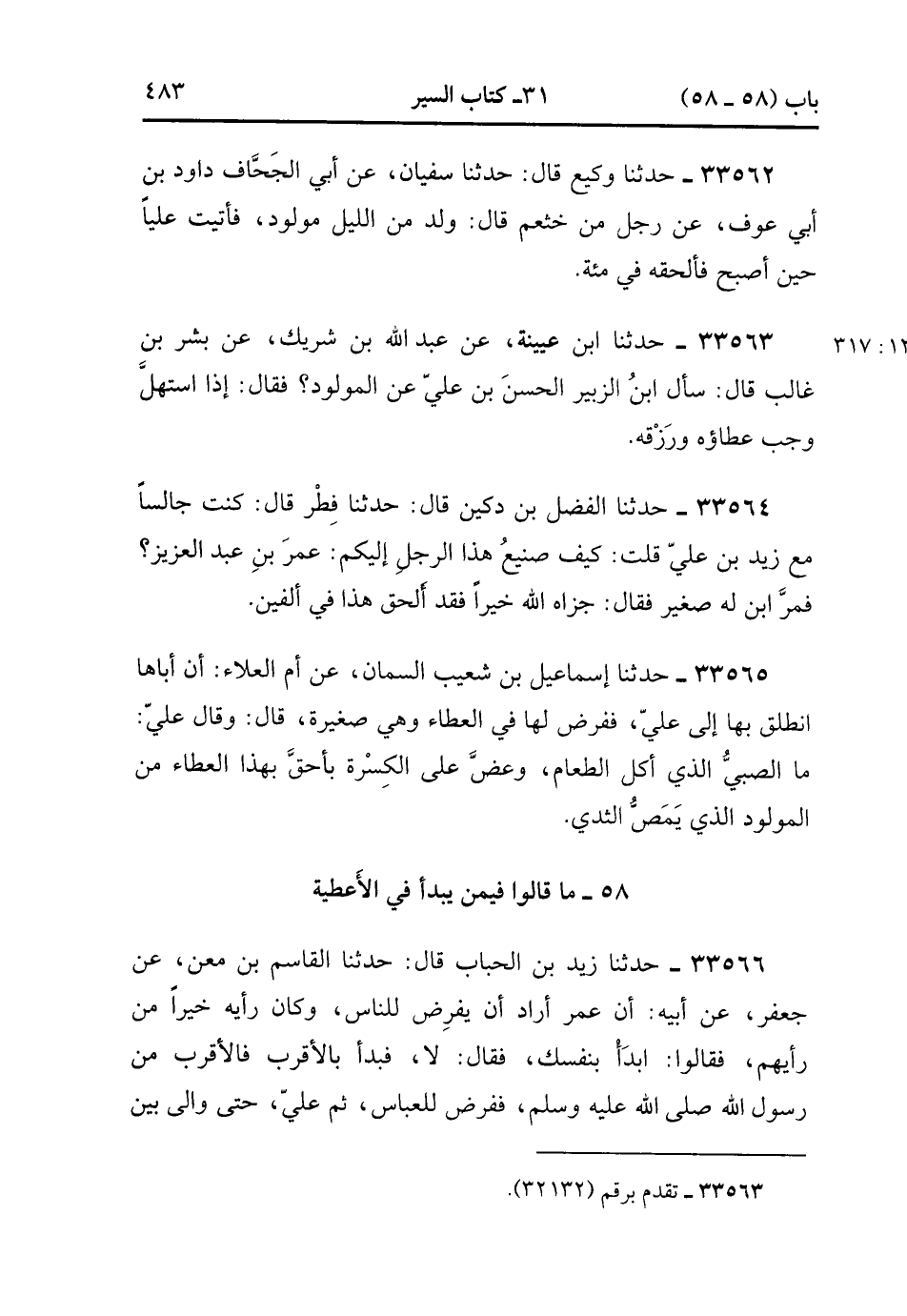 33562- حَدَّثَنَا وَكِيعٌ , قَالَ : حدَّثَنَا سُفْيَانُ ، عَنْ أَبِي الْجَحَّافِ دَاوُد بْنِ أَبِي عَوْفٍ ، عَنْ رَجُلٍ مِنْ خَثْعَمَ ، قَالَ : وُلِدَ لِي مِنَ اللَّيْلِ مَوْلُود , فَأَتَيْت عَلِيًّا حِينَ أَصْبَحَ فَأَلْحَقَهُ فِي مِئَةٍ. (12/314).