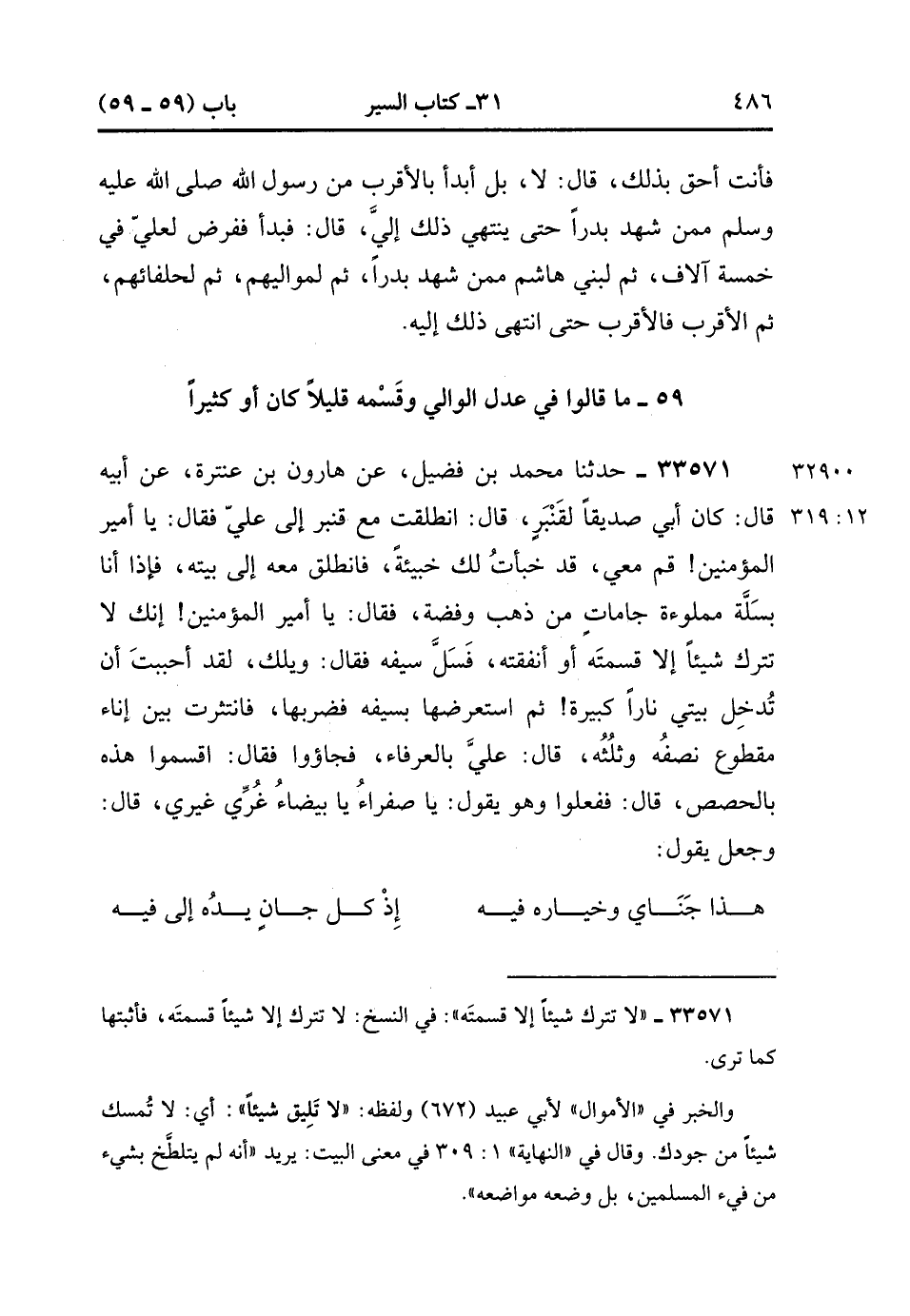 33571- حَدَّثَنَا مُحَمَّدُ بْنُ فُضَيْلٍ ، عَنْ هَارُونَ بْنِ عَنْتَرَةَ ، عَنْ أَبِيهِ ،(12/318) قَالَ : كَانَ أَبِي صِدِّيقًا لِقَنْبَرٍ ، قَالَ : انْطَلَقْت مَعَ قَنْبَرٍ إلَى عَلِيٍّ ، فَقَالَ : يَا أَمِيرَ الْمُؤْمِنِينَ , قُمْ مَعِي , قَدْ خَبَّأْت لَكَ خَبِيئَةً , فَانْطَلَقَ مَعَهُ إلَى بَيْتِهِ , فَإِذَا أَنَا بِسِلَّةٍ مَمْلُوءَةٍ جَامَاتٍ مِنْ ذَهَبٍ وَفِضَّةٍ ، فَقَالَ : يَا أَمِيرَ الْمُؤْمِنِينَ , إنَّك لاَ تَتْرُكُ شَيْئًا إِلاَّ قَسَمْته ، أَوْ أَنْفَقْته , فَسَلَّ سَيْفَهُ ، فَقَالَ : وَيْلَك , لَقَدْ أَحْبَبْت أَنْ تُدْخِلَ بَيْتِي نَارًا كَبِيرَةً ، ثُمَّ اسْتَعْرَضَهَا بِسَيْفِهِ فَضَرَبَهَا فَانْتَثَرَتْ بَيْنَ إنَاءٍ مَقْطُوعٍ نِصْفُهُ وَثُلُثُهُ ، قَالَ : عَلَيَّ بِالْعُرَفَاءِ فَجَاؤُوا ، فَقَالَ : اقْسِمُوا هَذِهِ بِالْحِصَصِ ، قَالَ فَفَعَلُوا وَهُوَ يَقُولُ : يَا صَفْرَاءُ يَا بَيْضَاءُ غُرِّي غَيْرِي ، قَالَ : وَجَعَلَ يَقُولُ :