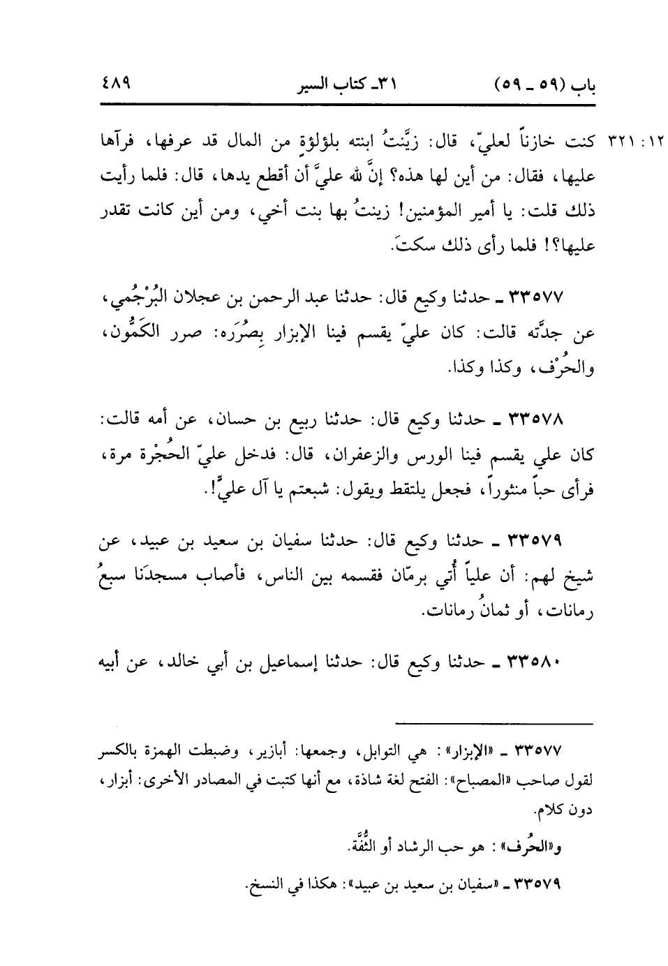33577- حَدَّثَنَا وَكِيعٌ , قَالَ : حدَّثَنَا عَبْدُ الرَّحْمَن بْنُ عَجْلاَنَ الْبُرْجُمِيُّ ، عَنْ جَدَّتِهِ ، قَالَتْ : كَانَ عَلِيٌّ يَقْسِمُ فِينَا الإِبزار بِصُرَرِه : صُرَر الْكَمُّونِ والحُرف وَكَذَا وَكَذَا.
