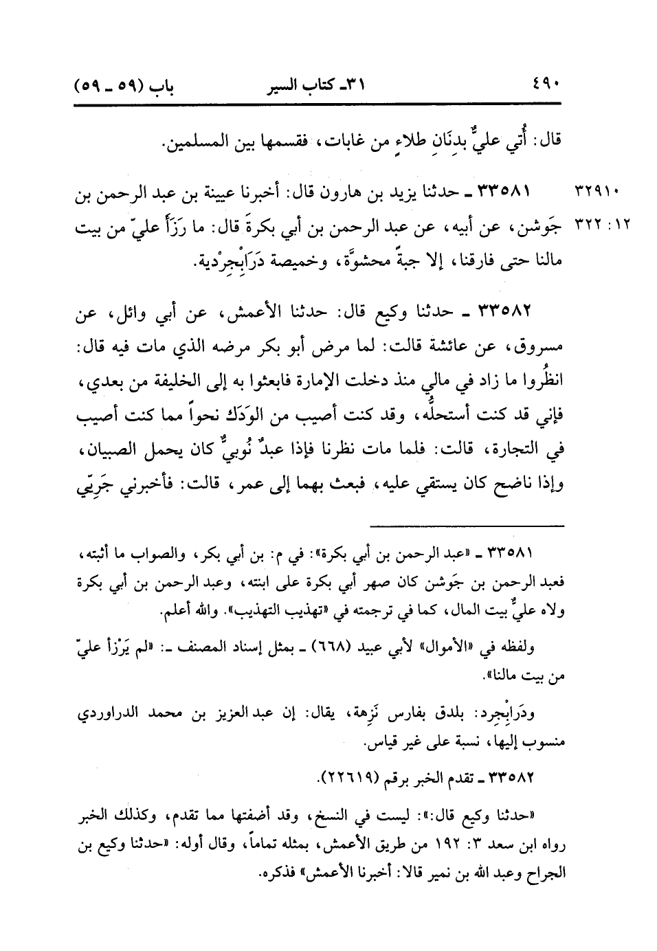 33581- حَدَّثَنَا يَزِيدُ بْنُ هَارُونَ , قَالَ : أَخْبَرَنَا عُيَيْنَةُ بْنُ عَبْدِ الرَّحْمَنِ بْنِ جَوْشَنٍ ، عَنْ أَبِيهِ ، عَنْ عَبْدِ الرَّحْمَنِ بْنِ أَبِي بَكْرَةَ ، قَالَ : مَا رَزَأَ عَلِيٌّ مِنْ بَيْتِ مَالِنَا حَتَّى فَارَقَنَا إِلاَّ جُبَّةً مَحْشُوَّةً وَخَمِيصَةَ دَرَابِْجِرْدِيَّةٍ . (12/321).