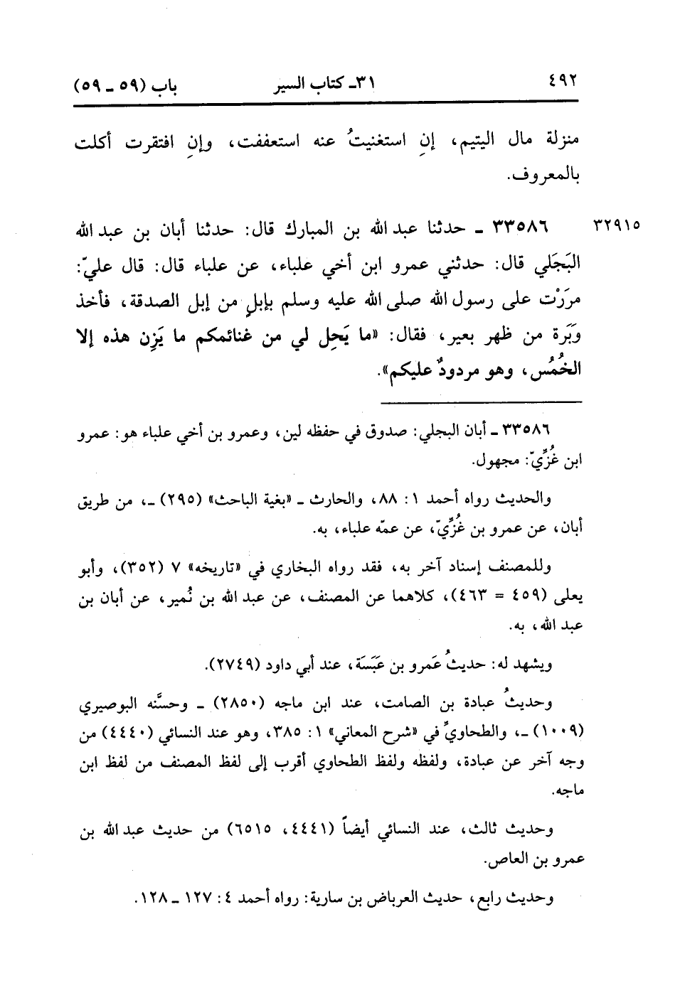 33586- حَدَّثَنَا عَبْدُ اللهِ بْنُ الْمُبَارَكِ , قَالَ : حدَّثَنَا أَبَانُ بْنُ عَبْدِ اللهِ الْبَجَلِيُّ ، قَالَ : حدَّثنِي عَمْرو بْنُ أَخِي عِلْبَاءُ عن عِلْبَاءَ ، قَالَ : قَالَ عَلِيٌّ : مَرَرْت عَلَى رَسُولِ اللهِ صَلَّى الله عَلَيْهِ وَسَلَّمَ بِإِبِلٍ مِنْ إبِلِ الصَّدَقَةِ ، فَأَخَذَ وَبَرَةً مِنْ ظَهْرِ بَعِيرٍ ، فَقَالَ : مَا يَحِلُّ لِي مِنْ غَنَائِمِكُمْ مَا يَزِنُ هَذِهِ ، إِلاَّ الْخُمُسُ ، وَهُوَ مَرْدُودٌ عَلَيْكُمْ. (12/324).