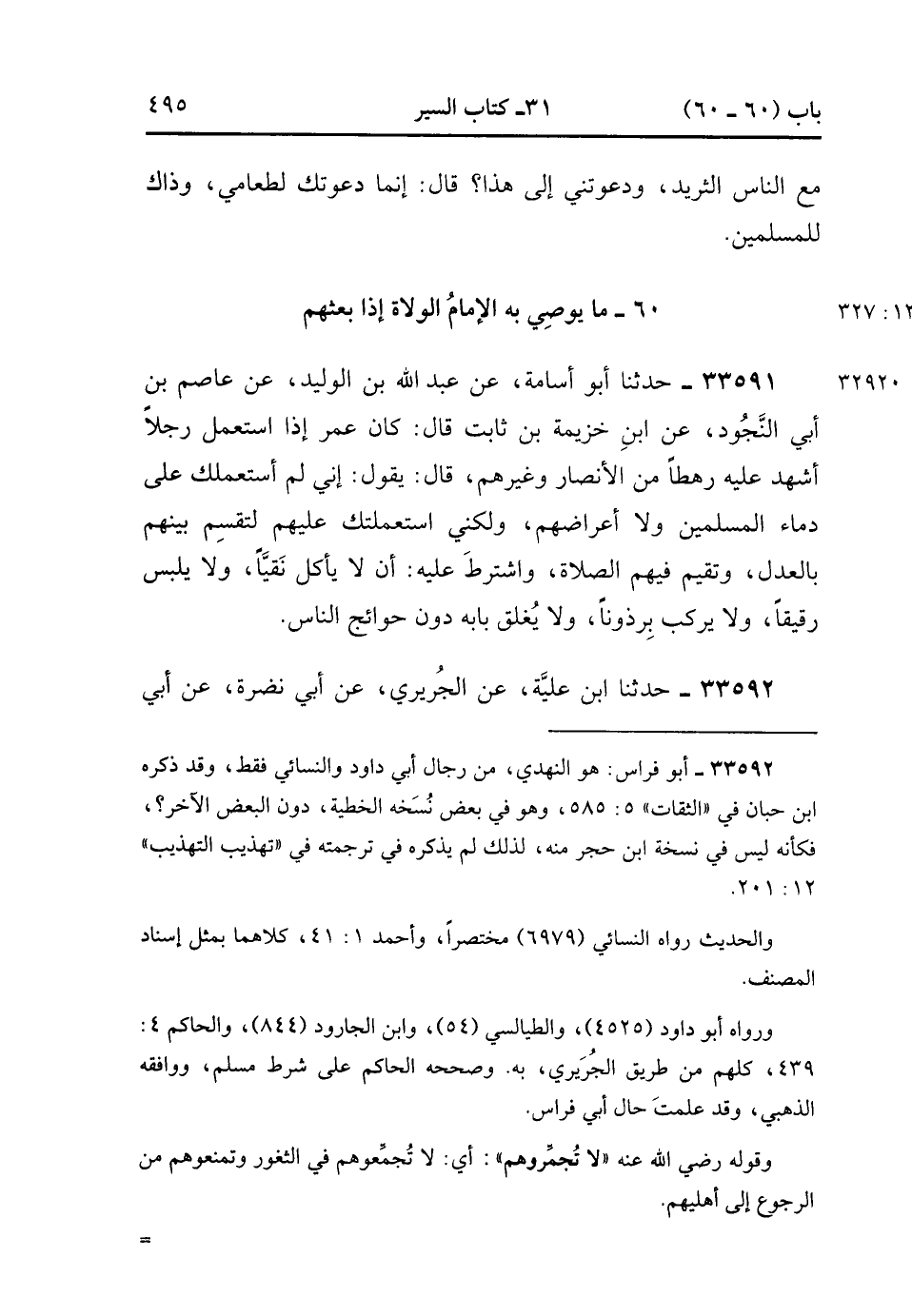 33592- حَدَّثَنَا ابْنُ عُلَيَّةَ ، عَنِ الْجُرَيْرِيِّ ، عَنْ أَبِي نَضْرَةَ ، عَنْ أَبِي فِرَاسٍ ، قَالَ : خَطَبَ عُمَرُ بْنُ الْخَطَّابِ ، فَقَالَ : أَلاَ إنِّي وَاللهِ مَا أَبْعَثُ إلَيْكُمْ عُمَّالاً لِيَضْرِبُوا أَبْشَارَكُمْ ، وَلاَ لِيَأْخُذُوا أَمْوَالَكُمْ , وَلَكِنْ أَبْعَثُهُمْ إلَيْكُمْ لِيُعَلِّمُوكُمْ دِينَكُمْ وَسُنَّتَكُمْ , فَمَنْ فُعِلَ بِهِ سِوَى ذَلِكَ فَلْيَرْفَعْهُ إِلَيَّ , فَوَالَّذِي نَفْسِي بِيَدِهِ لاَقِصَّنَّهُ مِنْهُ , فَوَثَبَ عَمْرُو بْنُ الْعَاصِ فَقَالَ : يَا أَمِيرَ الْمُؤْمِنِينَ , أَرَأَيْتُك إِنْ كَانَ رَجُلٌ مِنَ الْمُسْلِمِينَ عَلَى رَعِيَّةٍ فَأَدَّبَ بَعْضَ رَعِيَّتِهِ إنَّك لَمُقِصُّهُ مِنْهُ ؟ قَالَ : إِيْ وَالَّذِي نَفْسُ عُمَرَ بِيَدِهِ لأَقِصَّنَّهُ مِنْهُ , أَنَّى لاَ أُقِصُّهُ مِنْهُ وَقَدْ رَأَيْت رَسُولَ اللهِ صَلَّى الله عَلَيْهِ وَسَلَّمَ يُقِصُّ مِنْ نَفْسِهِ أَلاَ لاَ تَضْرِبُوا الْمُسْلِمِينَ فَتُذِلُّوهُمْ , وَلاَ تَمْنَعُوهُمْ مِنْ حُقُوقِهِمْ فَتُكَفِّرُوهُمْ , وَلاَ تَجْمُرُوهُمْ فَتَفْتِنُوهُمْ , وَلاَ تُنْزِلُوهُمَ الْغِيَاضَ فَتُضَيِّعُوهُمْ. (12/327).