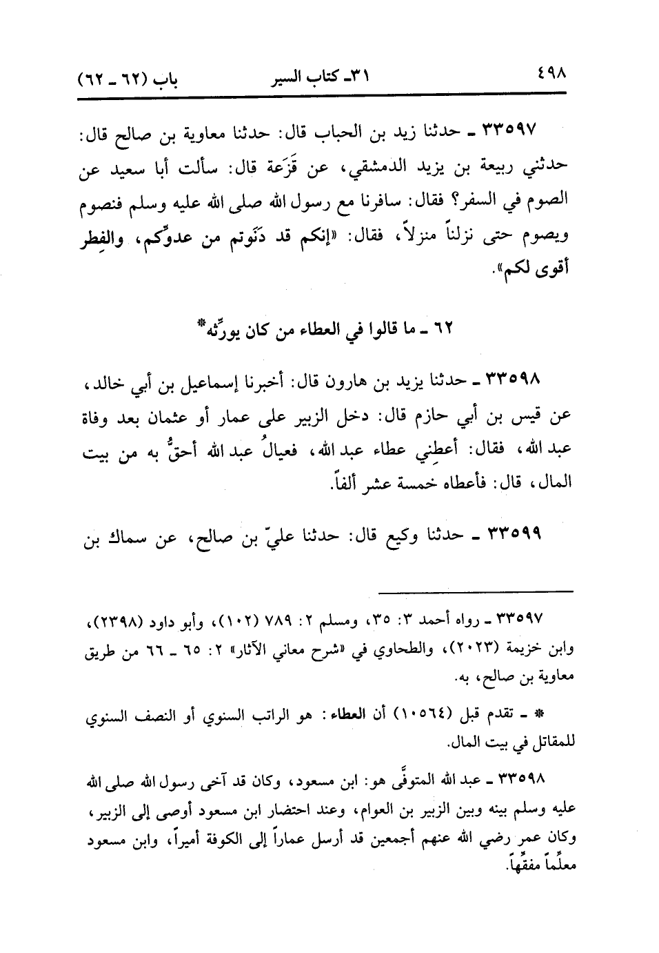 33599- حَدَّثَنَا وَكِيعٌ , قَالَ : حدَّثَنَا عَلِيُّ بْنُ صَالِحٍ ، عَنْ سِمَاكِ بْنِ حَرْبٍ ، عَنْ أَشْيَاخِ الْحَيِّ ، قَالُوا : مَاتَ رَجُلٌ وَقَدْ مَضَى لَهُ ثُلُثَا السَّنَةِ فَأَمَرَ لَهُ عُمَرُ بْنُ الْخَطَّابِ بِثُلُثِي عَطَائِهِ. (12/330).