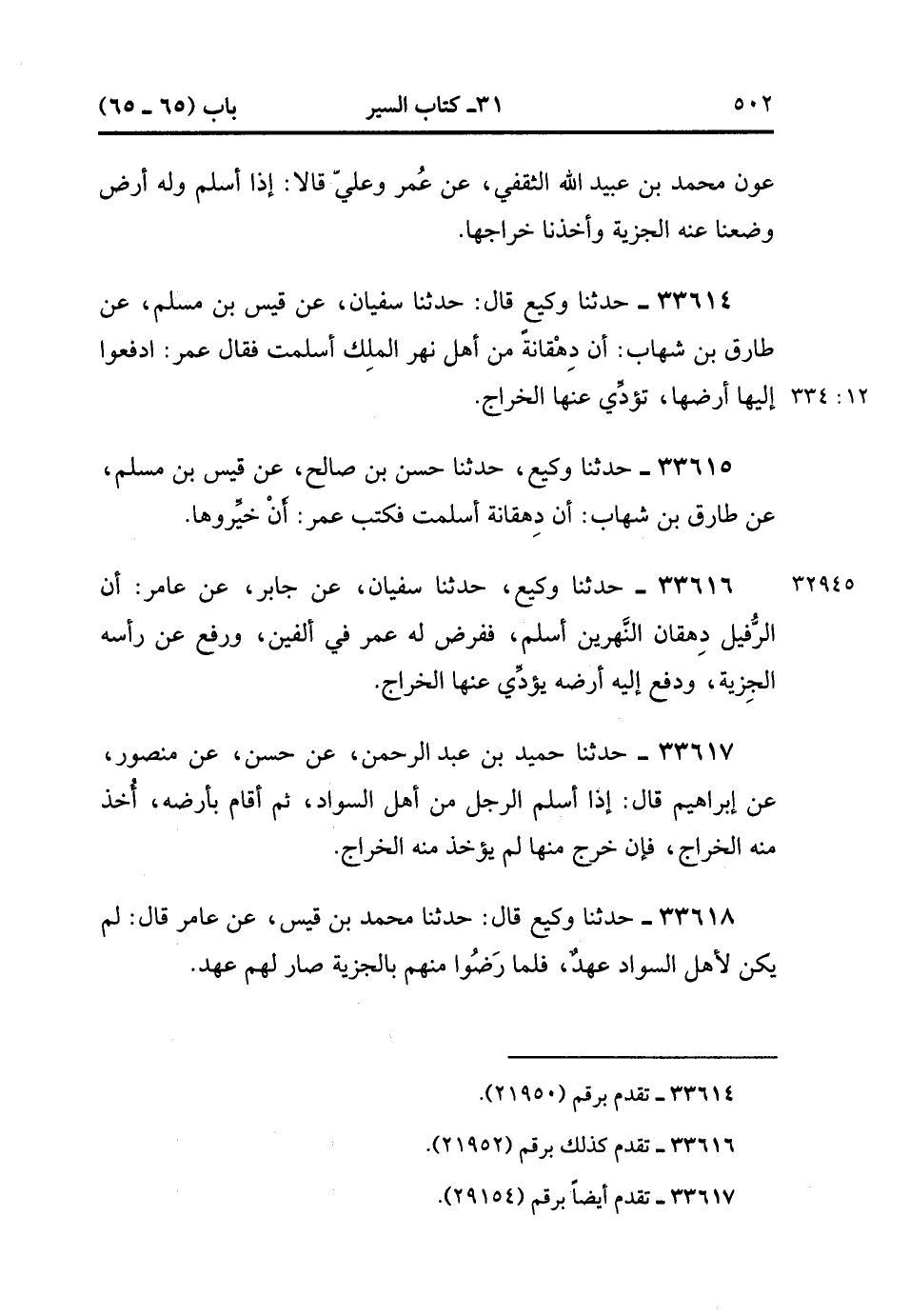 33614- حَدَّثَنَا وَكِيعٌ , قَالَ : حدَّثَنَا سُفْيَانُ ، عَنْ قَيْسِ بْنِ مُسْلِمٍ ، عَنْ طَارِقِ بْنِ شِهَابٍ أَنَّ دِهْقَانَةً مِنْ أَهْلِ نَهْرِ الْمَلِكِ أَسْلَمَتْ ، فَقَالَ عُمَرُ : ادْفَعُوا إلَيْهَا أَرْضَهَا تُؤَدِّي عنها الْخَرَاجَ. (12/333).
