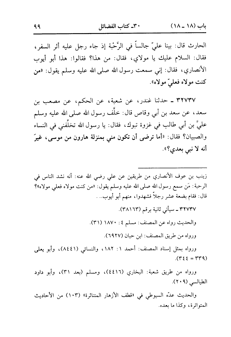 32737- حَدَّثَنَا غُنْدَرٌ , عَنْ شُعْبَةَ , عَنِ الْحَكَمِ , عَنْ مُصْعَبِ بْنِ سَعْدٍ , عَنْ سَعْدِ بْنِ أَبِي وَقَّاصٍ , قَالَ : خَلَّفَ رَسُولُ اللهِ صَلَّى الله عَلَيْهِ وَسَلَّمَ عَلِيَّ بْنَ أَبِي طَالِبٍ فِي غَزْوَةِ تَبُوكَ , فَقَالَ : يَا رَسُولَ اللهِ تُخَلِّفُنِي فِي النِّسَاءِ وَالصِّبْيَانِ , فَقَالَ : أَمَا تَرْضَى أَنْ تَكُونَ مِنِّي بِمَنْزِلَةِ هَارُونَ مِنْ مُوسَى غَيْرَ أَنَّهُ لاَ نَبِيَّ بَعْدِي. (12/60).