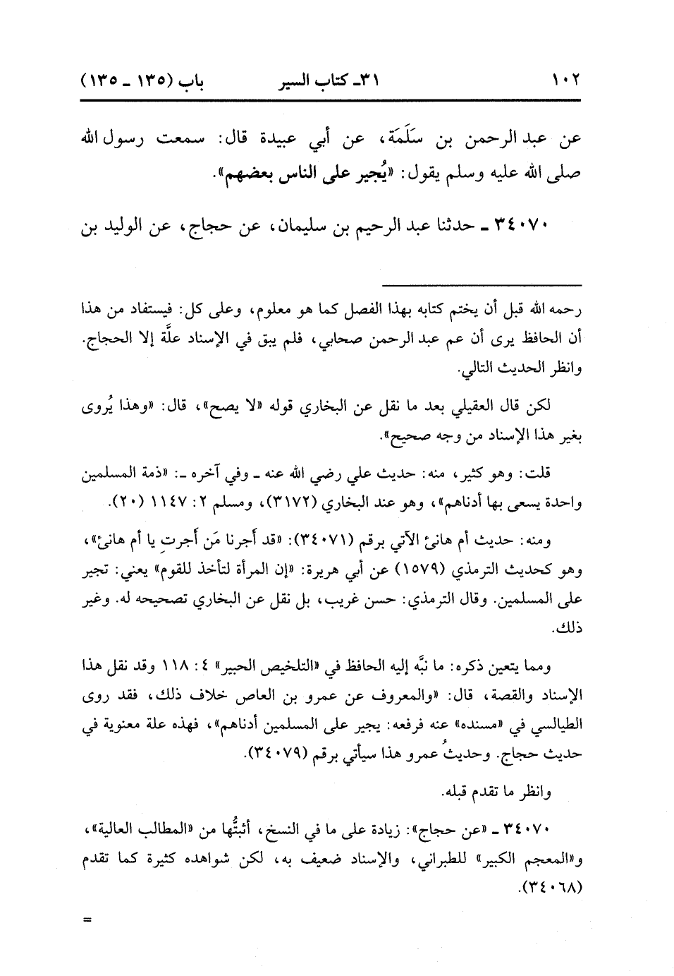 34070- حَدَّثَنَا عَبْدُ الرَّحِيمِ بْنُ سُلَيْمَانَ ، عَنْ حَجَّاجٍ ، عَنِ الْوَلِيدِ بْنِ أَبِي مَالِكٍ ، عَنِ الْقَاسِمِ بْنِ عَبْدِ الرَّحْمَنِ ، عَنْ أَبِي أُمَامَةَ ، عَنِ النَّبِيِّ صَلَّى الله عَلَيْهِ وَسَلَّمَ ، قَالَ : يُجِيرُ عَلَى الْمُسْلِمِينَ الرَّجُلُ مِنْهُمْ. (12/452).