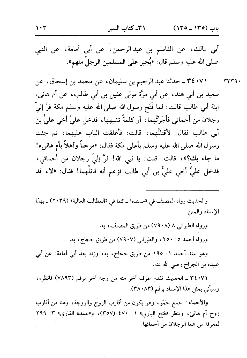 34071- حَدَّثَنَا عَبْدُ الرَّحِيمِ بْنُ سُلَيْمَانَ ، عَنْ مُحَمَّدِ بْنِ إِسْحَاقَ ، عَنْ سَعِيدِ بْنِ أَبِي هِنْدَ ، عَنْ أَبِي مُرَّةَ مَوْلَى عَقِيلِ بْنِ أَبِي طَالِبٍ ، عَنْ أُمِّ هَانِئِ ابْنَةِ أَبِي طَالِبٍ ، قَالَتْ : لَمَّا فَتَحَ رَسُولُ اللهِ صَلَّى الله عَلَيْهِ وَسَلَّمَ مَكَّةَ ، فَرَّ إِلَيَّ رَجُلاَنِ مِنْ أَحْمَائِي فَأَجَرْتُهُمَا ، أَوْ كَلِمَةً تُشْبِهُهَا ، فَدَخَلَ عَلَيَّ أَخِي عَلِيُّ بْنُ أَبِي طَالِبٍ ، فَقَالَ : لأَقْتُلَنَّهُمَا ، قَالَتْ : فَأَغْلَقْتُ الْبَابَ عَلَيْهِمَا ، ثُمَّ جِئْتُ رَسُولَ اللهِ صَلَّى الله عَلَيْهِ وَسَلَّمَ بِأَعْلَى مَكَّةَ ، فَقَالَ : مَرْحَبًا ، وَأَهْلاً بِأُمِّ هَانِئٍ , مَا جَاءَ بِكِ ؟ قَالَتْ : قُلْتُ : يَا نَبِيَّ اللهِ , فَرَّ إِلَيَّ رَجُلاَنِ مِنْ أَحْمَائِي ، فَدَخَلَ عَلَيَّ أَخِي عَلِيُّ بْنُ أَبِي طَالِبٍ فَزَعَمَ أَنَّهُ قَاتِلُهُمَا ، فَقَالَ : لاَ , قَدْ أَجْرَنَا مَنْ أَجَرْتِ ، وَأَمَّنَّا مَنْ أَمَّنْتِ. (12/452).