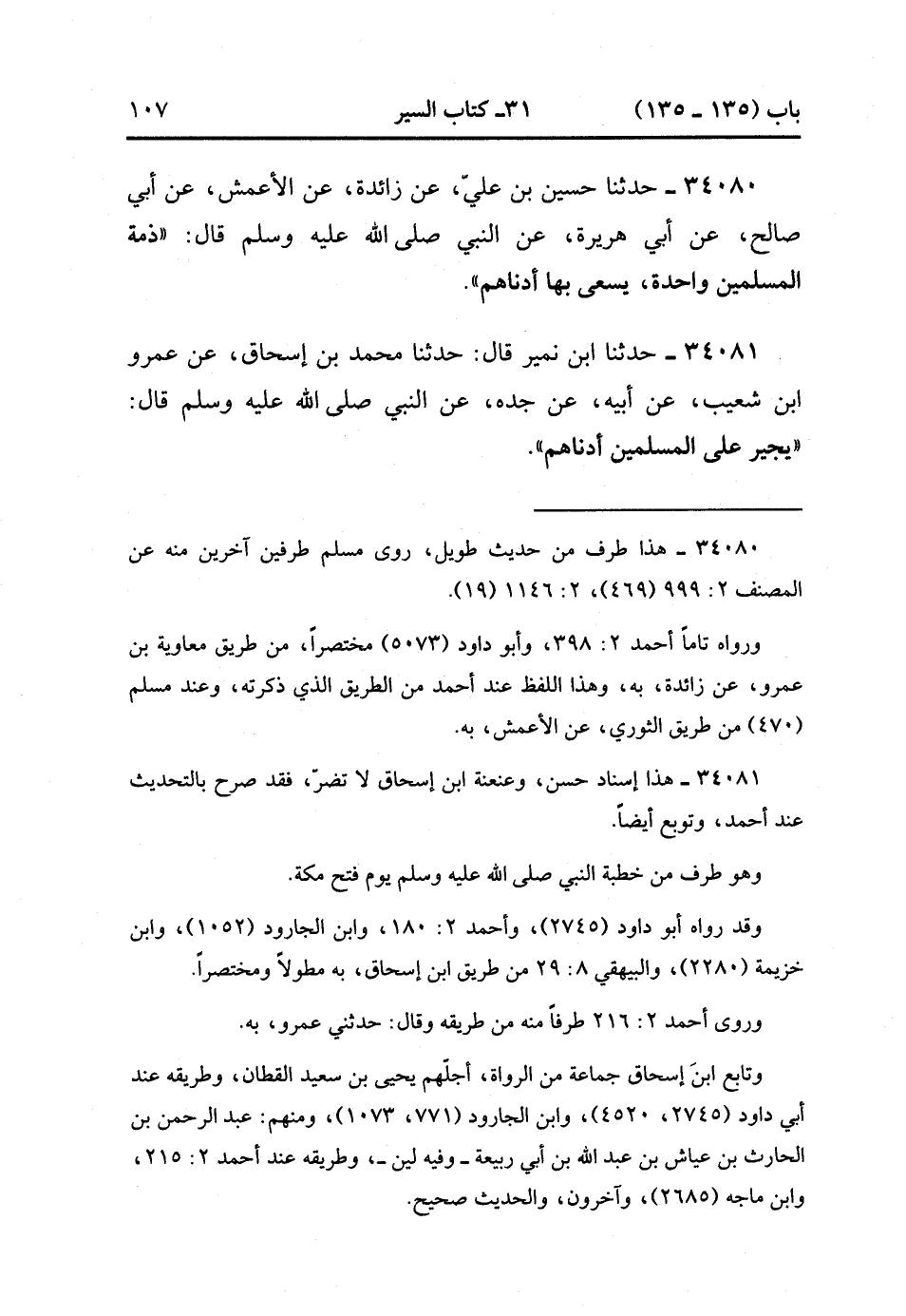 34080- حَدَّثَنَا حُسَيْنُ بْنُ عَلِيٍّ ، عَنْ زَائِدَةَ ، عَنِ الأَعْمَشِ ، عَنْ أَبِي صَالِحٍ ، عَنْ أَبِي هُرَيْرَةَ ، عَنِ النَّبِيِّ صَلَّى الله عَلَيْهِ وَسَلَّمَ ، قَالَ : ذِمَّةُ الْمُسْلِمِينَ وَاحِدَةٌ ، يَسْعَى بِهَا أَدْنَاهُمْ.