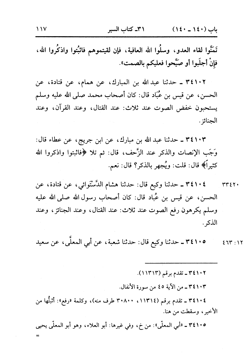 34102- حَدَّثَنَا عَبْدُ اللهِ بْنُ الْمُبَارَكِ ، عَنْ هَمَّامٍ ، عَنْ قَتَادَةَ ، عَنِ الْحَسَنِ ، عَنْ قَيْسِ بْنِ عُبَادٍ ، قَالَ : كَانَ أَصْحَابُ مُحَمَّدٍ صَلَّى الله عَلَيْهِ وَسَلَّمَ يَسْتَحِبُّونَ خَفْضُ الصَّوْتِ عِنْدَ ثَلاَثٍ ؛ عِنْدَ الْقِتَالِ ، وَعِنْدَ الْقُرْآنِ ، وَعِنْدَ الْجَنَائِزِ.
