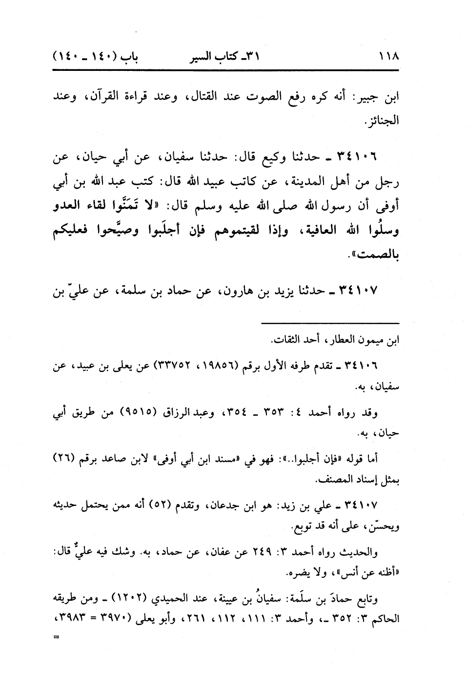 34106- حَدَّثَنَا وَكِيعٌ , قَالَ : حدَّثَنَا سُفْيَانُ ، عَنْ أَبِي حَيَّانَ ، عَنْ رَجُلٍ مِنْ أَهْلِ الْمَدِينَةِ ، عَنْ كَاتِبِ عُبَيْدِ اللهِ ، قَالَ : كَتَبَ عَبْدُ اللهِ بْنُ أَبِي أَوْفَى ، أَنَّ رَسُولَ اللهِ صَلَّى الله عَلَيْهِ وَسَلَّمَ قَالَ : لاَ تَمَنَّوْا لِقَاءَ الْعَدُوِّ ، وَسَلُوا اللَّهَ الْعَافِيَةَ , وَإِذَا لَقِيتُمُوهُمْ ، فَإِنْ أَجْلَبُوا وَصَيَّحُوا فَعَلَيْكُمْ بِالصَّمْتِ.