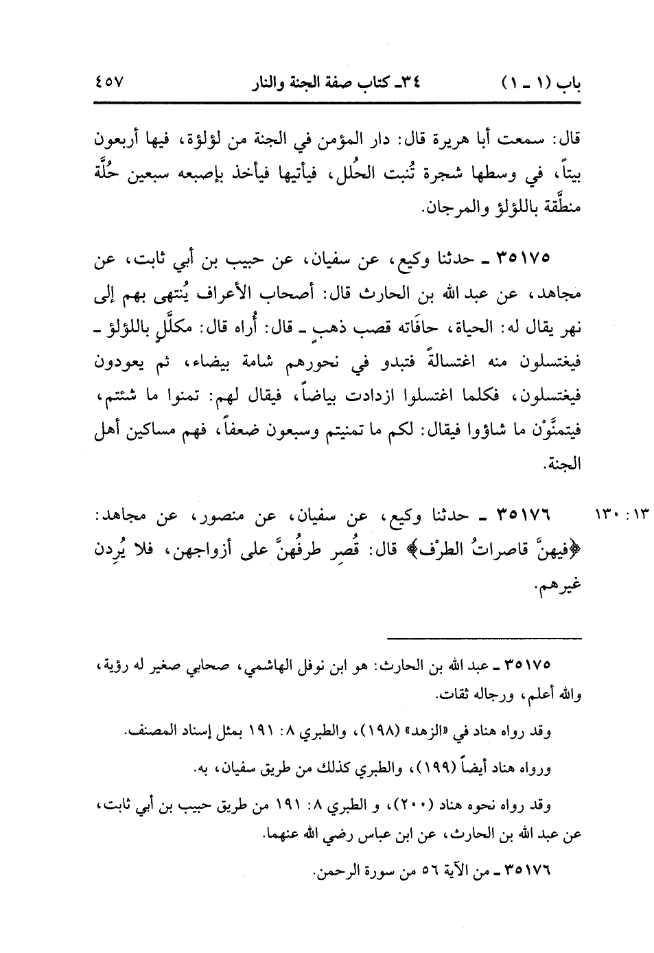 35175- حَدَّثَنَا وَكِيعٌ ، عَنْ سُفْيَانَ ، عَنْ حَبِيبِ بْنِ أَبِي ثَابِتٍ ، عَنْ مُجَاهِدٍ ، عَنْ عَبْدِ اللهِ بْنِ الْحَارِثِ ، قَالَ : أَصْحَابُ الأَعْرَافِ يُنْتَهَى بِهِمْ إِلَى نَهْرٍ ، يُقَالَ لَهُ : الْحَيَاةُ ، حَافَاتُهُ قَصَبُ ذَهَبٍ ، قَالَ : أُرَاهُ قَالَ : مُكَلَّلٌ بِاللُّؤْلُؤِ ، فَيَغْتَسِلُونَ مِنْهُ اغْتِسَالَةً ، فَتَبْدُو فِي نُحُورِهِمْ شَامَةٌ بَيْضَاءُ ، ثُمَّ يَعُودُونَ فَيَغْتَسِلُونَ ، فَكُلَّمَا اغْتَسَلُوا ازْدَادَتْ بَيَاضًا ، فَيُقَالَ لَهُمْ : تَمَنَّوْا مَا شِئْتُمْ ، فَيَتَمَنَّوْنَ مَا شَاؤُوا ، فَيُقَالَ : لَكُمْ مَا تَمَنَّيْتُمْ وَسَبْعُونَ ضِعْفًا ، فَهُمْ مَسَاكِينُ أَهْلِ الْجَنَّةِ. (13/129).