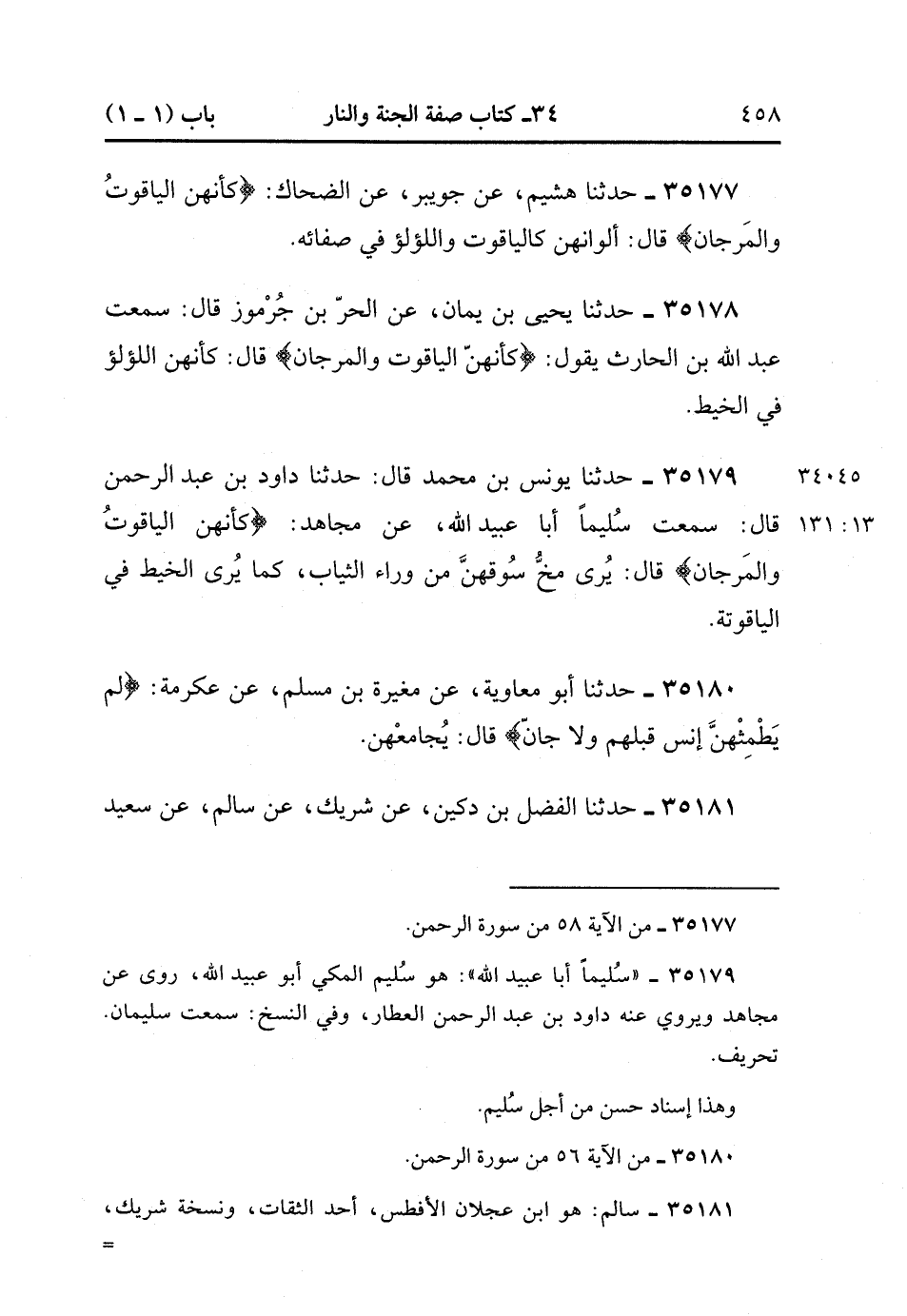 35178- حَدَّثَنَا يَحْيَى بْنُ يَمَانٍ ، عَنِ الْحُرِّ بْنِ جُرْمُوزٍ ، قَالَ : سَمِعْتُ عَبْدَ اللهِ بْنَ الْحَارِثِ ، يَقُولُ : {كَأَنَّهُنَّ الْيَاقُوتُ وَالْمَرْجَانُ} قَالَ : كَأَنَّهُنَّ اللُّؤْلُؤُ فِي الْخَيْطِ.