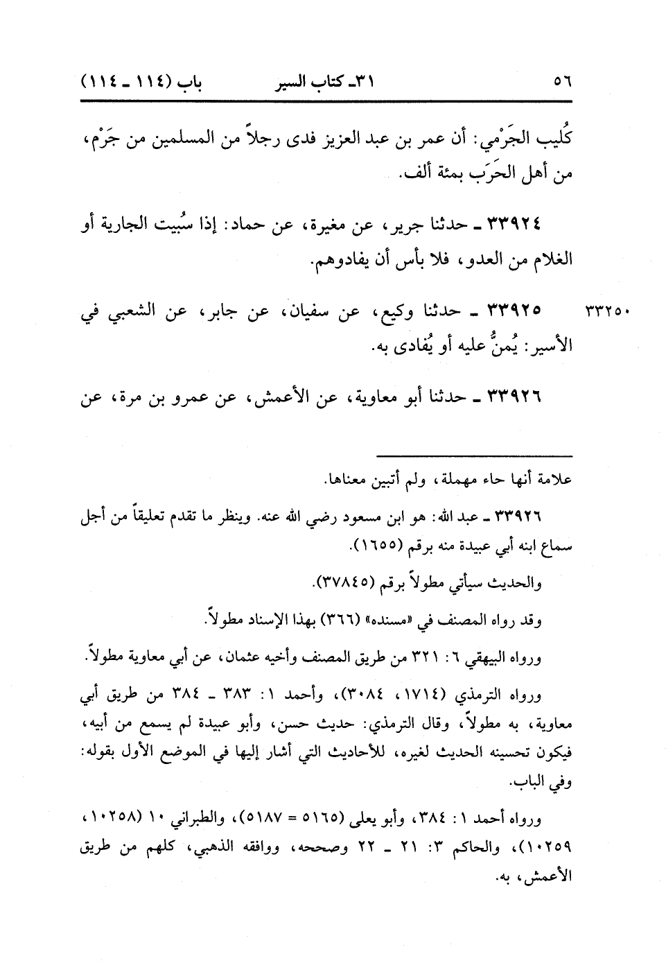 33926- حَدَّثَنَا أَبُو مُعَاوِيَةَ ، عَنِ الأَعْمَشِ ، عَنْ عَمْرِو بْنِ مُرَّةَ ، عَنْ أَبِي عُبَيْدَةَ ، عَنْ عَبْدِ اللهِ ، قَالَ : لَمَّا كَانَ يَوْمُ بَدْرٍ ، قَالَ رَسُولُ اللهِ صَلَّى الله عَلَيْهِ وَسَلَّمَ : مَا تَقُولُونَ فِي هَؤُلاَءِ الأُسَارَى ؟ قَالَ : ثُمَّ قَالَ : لاَ يُفْلِتَنَّ أَحَدٌ مِنْهُمْ إِلاَّ بِفِدَاءٍ ، أَوْ ضَرْبَةِ عُنُقٍ. (12/417).