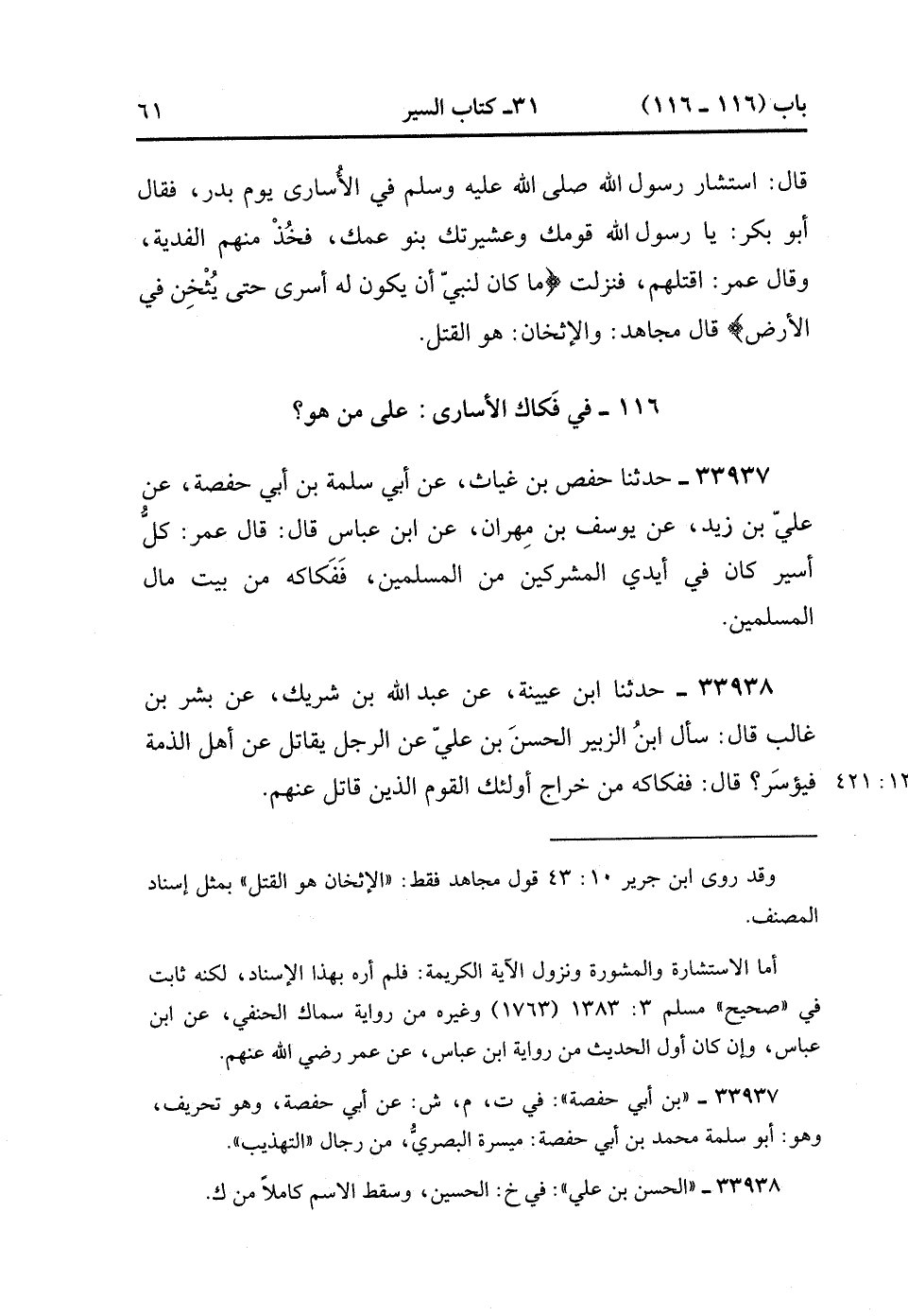 33937- حَدَّثَنَا حَفْصُ بْنُ غِيَاثٍ ، عَنْ أَبِي سَلَمَةَ بْن أَبِي حَفْصَةَ ، عَنْ عَلِيِّ بْنِ زَيْدٍ ، عَنْ يُوسُفَ بْنِ مِهْرَانَ ، عَنِ ابْنِ عَبَّاسٍ ، قَالَ : قَالَ عُمَرُ : كُلَّ أَسِيرٍ كَانَ فِي أَيْدِي الْمُشْرِكِينَ مِنَ الْمُسْلِمِينَ ، فَفِكَاكُهُ مِنْ بَيْتِ مَالِ الْمُسْلِمِينَ.