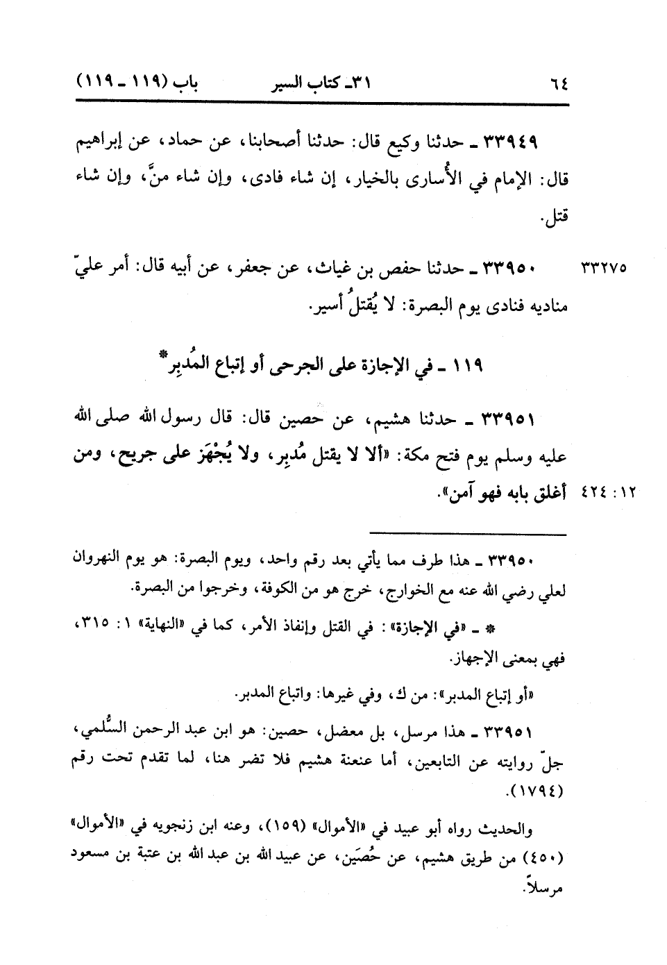 33951- حَدَّثَنَا هُشَيْمٌ ، عَنْ حُصَيْنٍ ، قَالَ : قَالَ رَسُولُ اللهِ صَلَّى الله عَلَيْهِ وَسَلَّمَ يَوْمَ فَتْحِ مَكَّةَ : أَلاَ لاَ يُقْتَلُ مُدْبِرٌ ، وَلاَ يُجْهَزُ عَلَى جَرِيحٍ , وَمَنْ أَغْلَقَ بَابَهُ فَهُوَ آمِنٌ. (12/423).