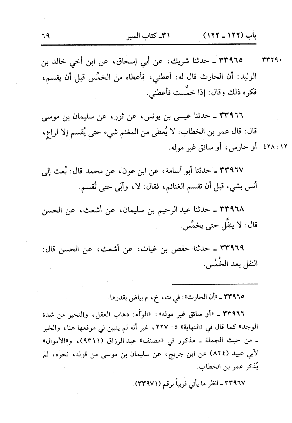 33966- حَدَّثَنَا عِيسَى بْنُ يُونُسَ ، عَنْ ثَوْرٍ ، عَنْ سُلَيْمَانَ بْنِ مُوسَى ، قَالَ : قَالَ عُمَرُ بْنُ الْخَطَّابِ : لاَ يُعْطَى مِنَ الْمَغْنَمِ شَيْءٌ حَتَّى يُقْسَمَ ، إِلاَّ لِرَاعٍ ، أَوْ حَارِسٍ ، أَوْ سَائِقٍ غَيْرِ مُوَلَّه. (12/427).