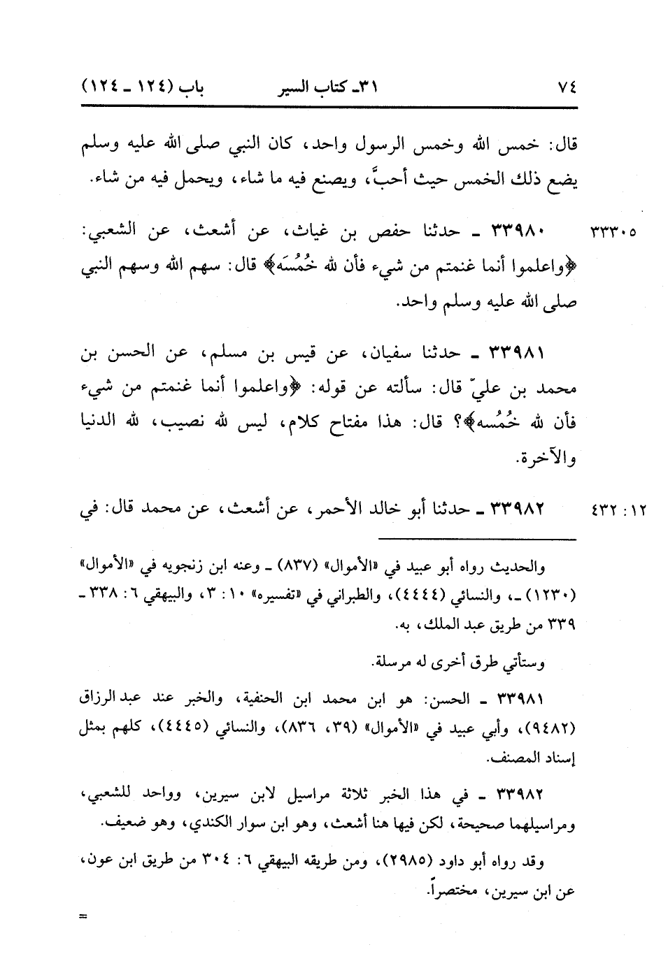 33980- حَدَّثَنَا حَفْصُ بْنُ غِيَاثٍ ، عَنْ أَشْعَثَ ، عَنِ الشَّعْبِيِّ ؛ {وَاعْلَمُوا أَنَّمَا غَنِمْتُمْ مِنْ شَيْءٍ فَأَنَّ لِلَّهِ خُمُسَهُ} ، قَالَ : سَهْمُ اللهِ ، وَسَهْمُ النَّبِيُّ صَلَّى الله عَلَيْهِ وَسَلَّمَ وَاحِدٌ.
