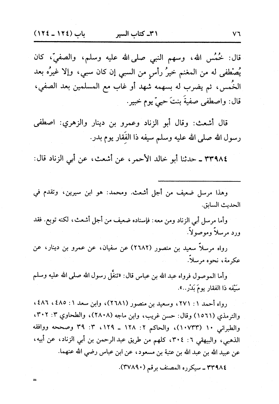 قَالَ أَشْعَثُ : وَقَالَ أَبُو الزِّنَادِ، وَعَمْرُو بْنُ دِينَارٍ ، وَالزُّهْرِيُّ : اصْطَفَى رَسُولُ اللهِ صَلَّى الله عَلَيْهِ وَسَلَّمَ سَيْفَهُ ذَا الْفِقَارِ يَوْمَ بَدْرٍ. (12/432).