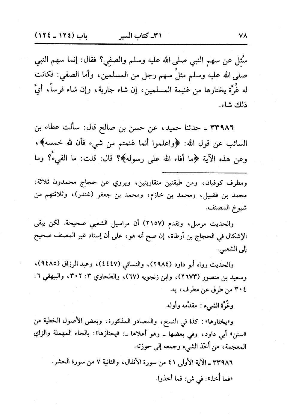 33986- حَدَّثَنَا حُمَيْدٌ ، عَنْ حَسَنِ بْنِ صَالِحٍ ، قَالَ : سَأَلْتُ عَطَاءَ بْنَ السَّائِبِ عَنْ قَوْلِ اللهِ : {وَاعْلَمُوا أَنَّمَا غَنِمْتُمْ مِنْ شَيْءٍ فَأَنَّ لِلَّهِ خُمُسَهُ} ، وَعَنْ هَذِهِ الآيَةِ : {مَا أَفَاءَ اللَّهُ عَلَى رَسُولِهِ} ؟ قَالَ : قُلْتُ : مَا الْفَيْءُ ؟ وَمَا الْغَنِيمَةُ ؟ قَالَ : إِذَا ظَهَرَ الْمُسْلِمُونَ عَلَى الْمُشْرِكِينَ وَعَلَى أَرْضِهِمْ ، فَأَخَذُوهُمْ عَنْوَةً ، فَمَا أُخِذَ مِنْ مَالٍ ظَهَرُوا عَلَيْهِ فَهُوَ غَنِيمَةٌ ، وَأَمَّا الأَرْضُ فَهِيَ فَيْءٌ , وَسَوَادُنَا هَذَا فَيْءٌ. (12/433).
