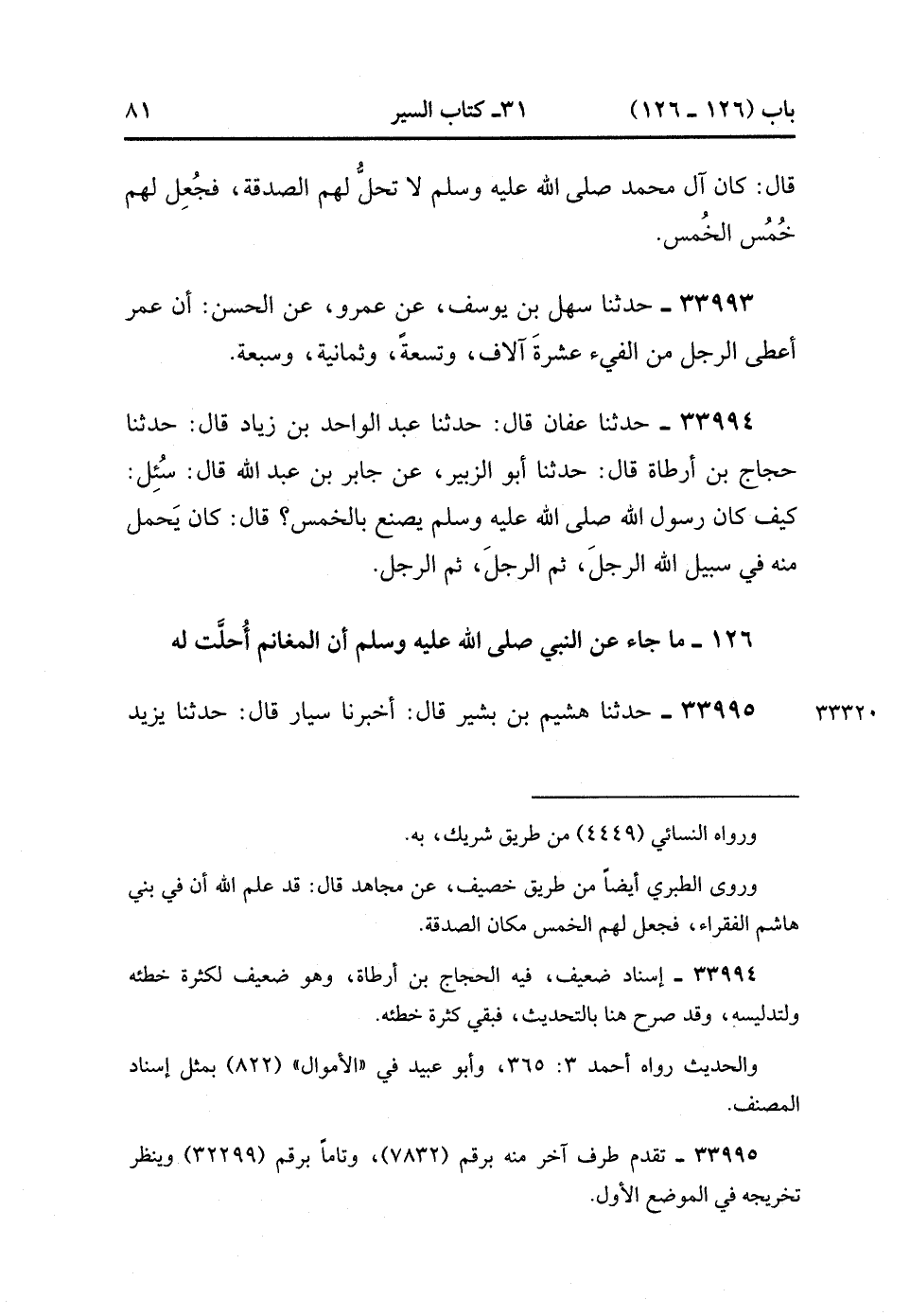 33995- حَدَّثَنَا هُشَيْمُ بْنُ بَشِيرٍ , قَالَ : أَخْبَرَنَا سَيَّارٌ ، قَالَ : حَدَّثَنَا يَزِيدُ الْفَقِيرُ , قَالَ : أَخْبَرَنَا جَابِرُ بْنُ عَبْدِ اللهِ ؛ أَنَّ رَسُولَ اللهِ صَلَّى الله عَلَيْهِ وَسَلَّمَ ، قَالَ : أُحِلَّتْ لِي الْغَنَائِم ، وَلَمْ تَحِلَّ لأَحَدٍ قَبْلِي. (12/435).