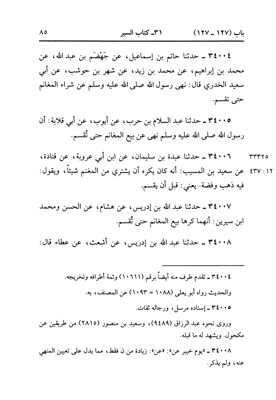 34004- حَدَّثَنَا حَاتِمُ بْنُ إِسْمَاعِيلَ ، عَنْ جَهْضَمِ بْنِ عَبْدِ اللهِ ، عَنْ مُحَمَّدِ بْنِ إِبْرَاهِيمَ ، عَنْ مُحَمَّدِ بْنِ زَيْدٍ ، عَنْ شَهْرِ بْنِ حَوْشَبٍ ، عَنْ أَبِي سَعِيدٍ الْخُدْرِيِّ ، قَالَ : نَهَى رَسُولُ اللهِ صَلَّى الله عَلَيْهِ وَسَلَّمَ عَنْ شِرَاءِ الْمَغَانِمِ حَتَّى تُقْسَمَ.