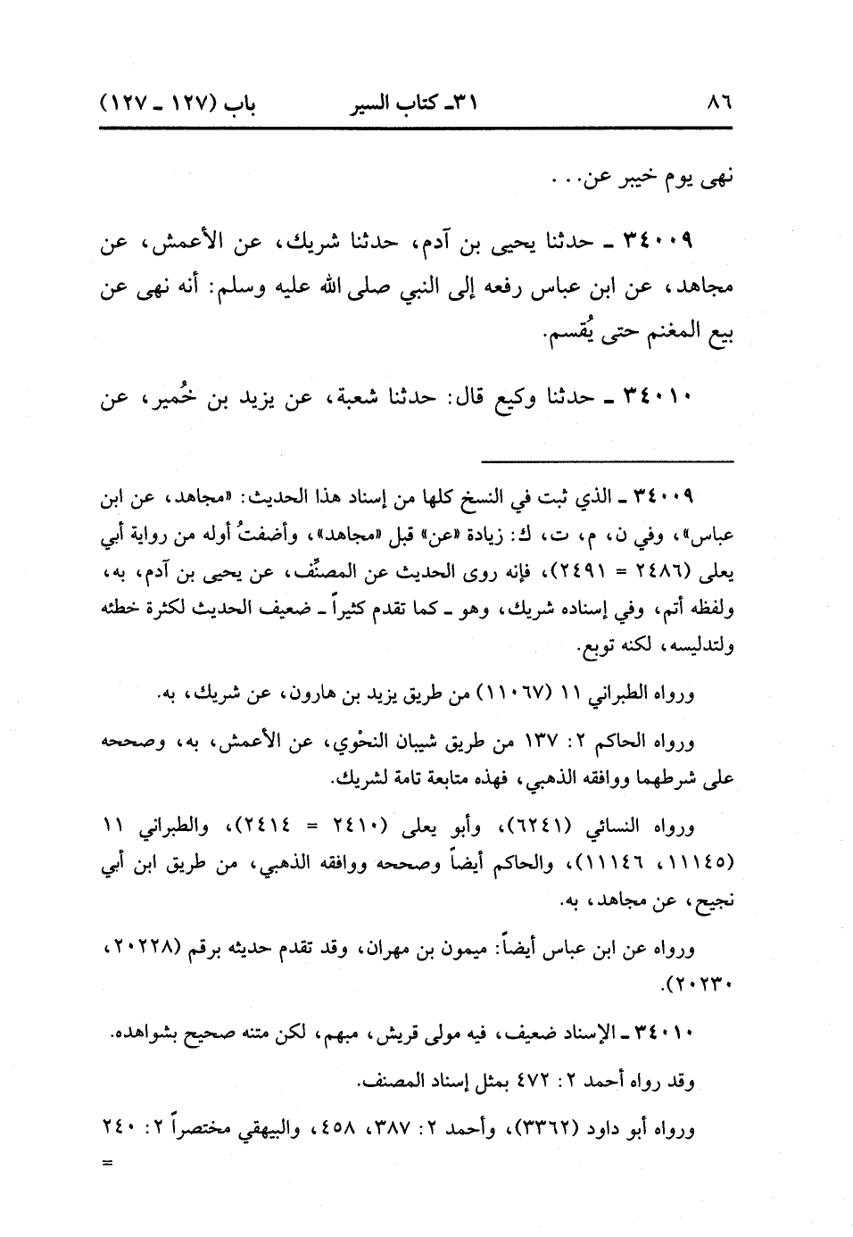 34009- حَدَّثَنَا يَحْيَى بْنُ آدَمَ ، حَدَّثَنَا شَرِيكٌ ، عَنِ الأَعْمَشِ ، عَنْ مُجَاهِدٍ ، عَنِ ابْنِ عَبَّاسٍ ،رَفَعَهُ إِلَى النَّبِيِّ صَلَّى الله عَلَيْهِ وَسَلَّمَ ؛ أَنَّهُ نَهَى عَنْ بَيْعِ الْمَغْنَمِ حَتَّى يُقْسَمَ.
