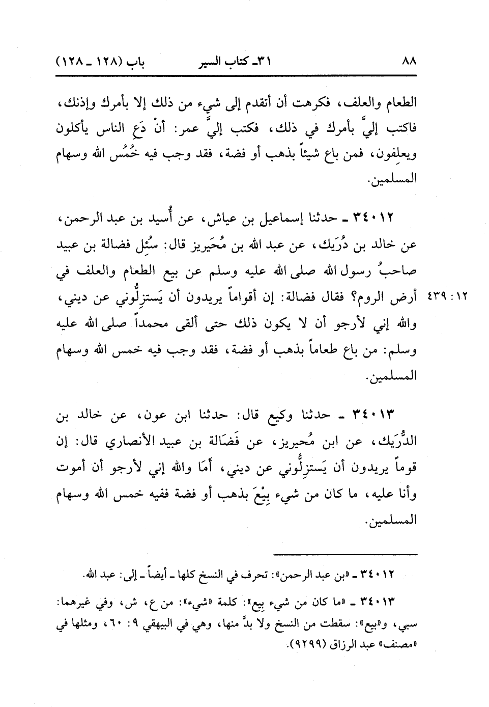 34012- حَدَّثَنَا إِسْمَاعِيلُ بْنُ عَيَّاشٍ ، عَنْ أُسَيْدِ بْنِ عَبْدِ الرَّحْمَنِ ، عَنْ خَالِدِ بْنِ دُرَيْكِ ، عَنْ عَبْدِ اللهِ بْنِ مُحَيْرِيزٍ ، قَالَ : سُئِلَ فَضَالَةُ بْنُ عُبَيْدٍ صَاحِبُ رَسُولِ اللهِ صَلَّى الله عَلَيْهِ وَسَلَّمَ عَنْ بَيْعِ الطَّعَامِ وَالْعَلَفِ فِي أَرْضِ الرُّومِ ؟ فَقَالَ فَضَالَةَ : إِنَّ أَقْوَامًا يُرِيدُونَ أَنْ يَسْتَزِلُّونِي عَنْ دِينِي , وَاللهِ إِنِّي لأَرْجُوَ أَنْ لاَ يَكُونَ ذَلِكَ حَتَّى أَلْقَى مُحَمَّدًا صَلَّى الله عَلَيْهِ وَسَلَّمَ : مَنْ بَاعَ طَعَامًا بِذَهَبٍ ، أَوْ فِضَّةٍ فَقَدْ وَجَبَ فِيهِ خُمُسُ اللهِ وَسِهَامُ الْمُسْلِمِينَ. (12/438).
