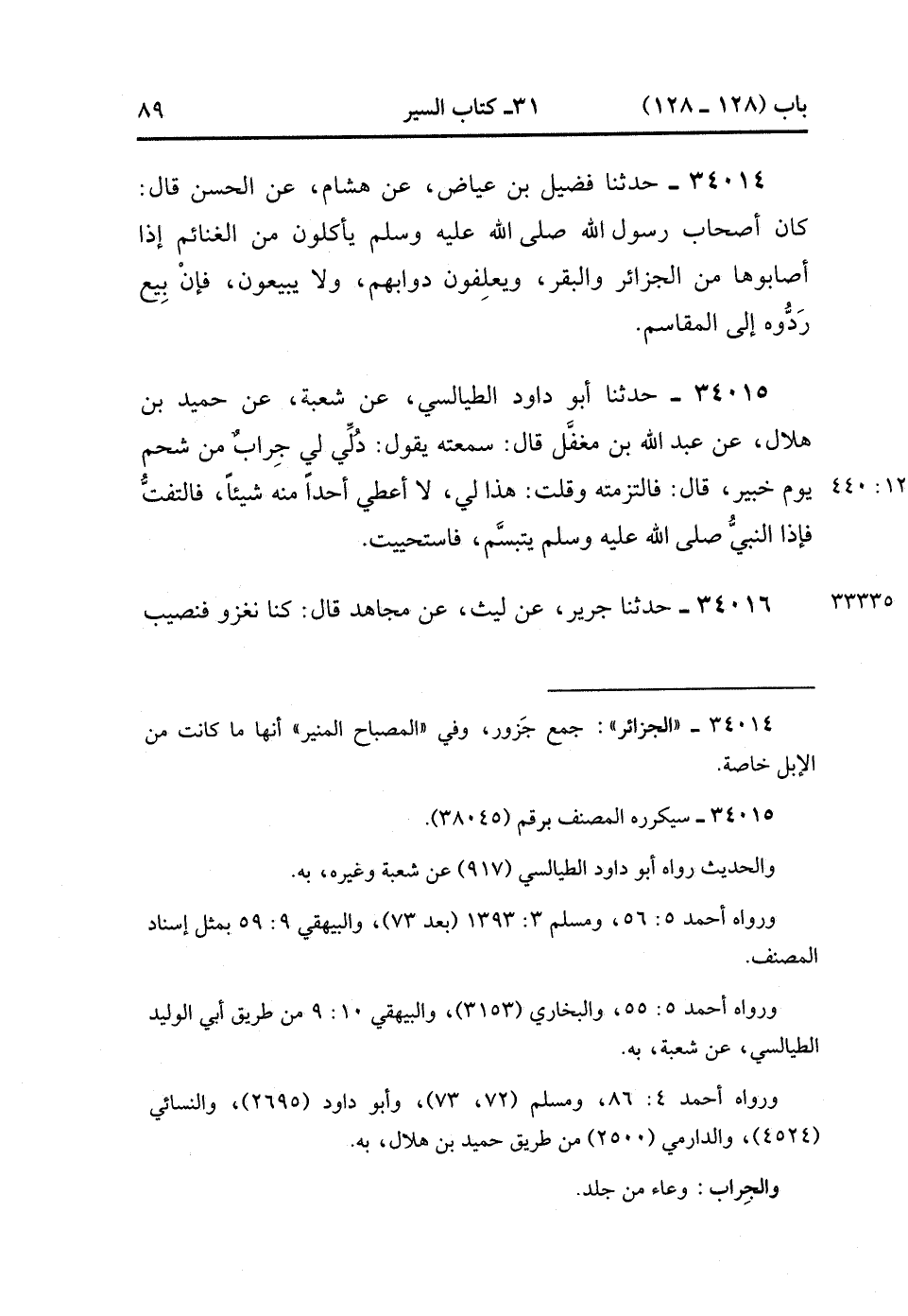 34014- حَدَّثَنَا فُضَيْلُ بْنُ عِيَاضٍ ، عَنْ هِشَامٍ ، عَنِ الْحَسَنِ ، قَالَ : كَانَ أَصْحَابُ رَسُولِ اللهِ صَلَّى الله عَلَيْهِ وَسَلَّمَ يَأْكُلُونَ مِنَ الْغَنَائِمِ إِذَا أَصَابُوهَا مِنَ الْجَزَائِرِ وَالْبَقَرِ ، وَيَعْلِفُونَ دَوَابَّهُمْ ، وَلاَ يَبِيعُونَ , فَإِنْ بِيْعَ رَدَّوهُ إِلَى الْمَقَاسِمِ.