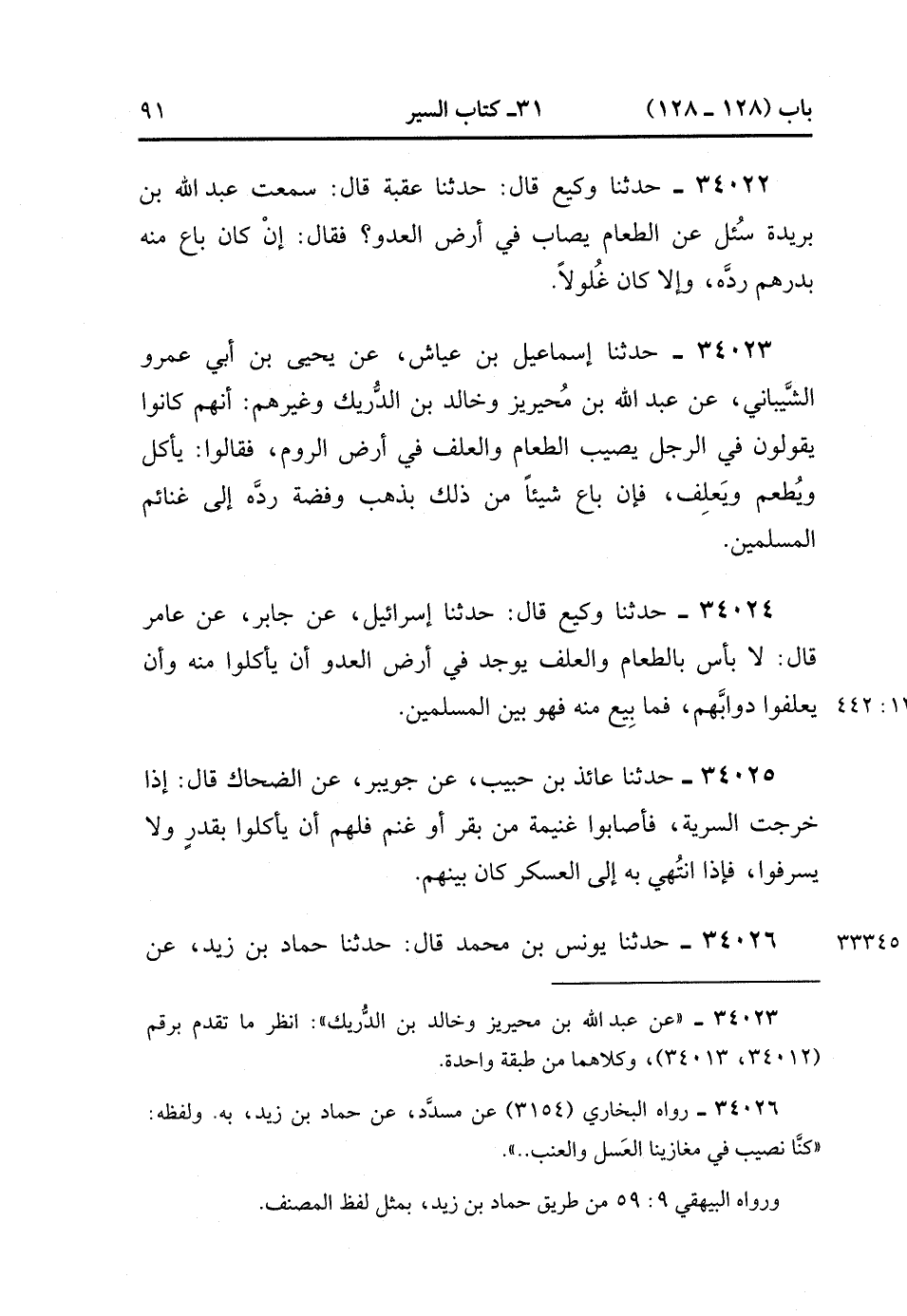 34023- حَدَّثَنَا إِسْمَاعِيلُ بْنُ عَيَّاشٍ ، عَنْ يَحْيَى بْنِ أَبِي عَمْرٍو السَّيْبَانِيِّ (1)، عَنْ عَبْدِ اللهِ بْنِ مُحَيْرِيزٍ ، وَخَالِدِ بْنِ الدُّرَيْكِ ، وَغَيْرِهِمْ ؛ أَنَّهُمْ كَانُوا يَقُولُونَ فِي الرَّجُلِ يُصِيبُ الطَّعَامَ وَالْعَلَفَ فِي أَرْضِ الرُّومِ ، فَقَالُوا : يَأْكُلُ وَيُطْعَمُ وَيَعْلِفُ , فَإِنْ بَاعَ شَيْئًا مِنْ ذَلِكَ بِذَهَبٍ وَفِضَّةٍ رَدَّهُ إِلَى غَنَائِمِ الْمُسْلِمِينَ. (12/441).