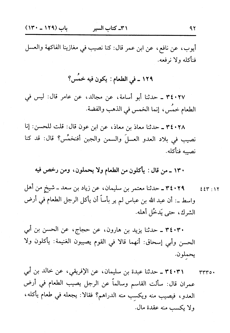 34031- حَدَّثَنَا عَبْدَةُ بْنُ سُلَيْمَانَ ، عَنِ الإِفْرِيقِيِّ ، عَنْ خَالِدِ بْنِ أَبِي عِمْرَانَ ، قَالَ : سَأَلْتُ الْقَاسِمَ ، وَسَالِمًا عَنِ الرَّجُلِ يُصِيبُ الطَّعَامَ فِي أَرْضِ الْعَدُوِّ ، فَيُصِيبُ مِنْهُ ، وَيَكْسِبُ مِنْهُ الدَّرَاهِمَ ؟ فَقَالاَ : يَجْعَلُهُ فِي طَعَامٍ يَأْكُلُهُ ، وَلاَ يَكْسِبُ مِنْهُ عُقْدَةَ مَالٍ. (12/443).