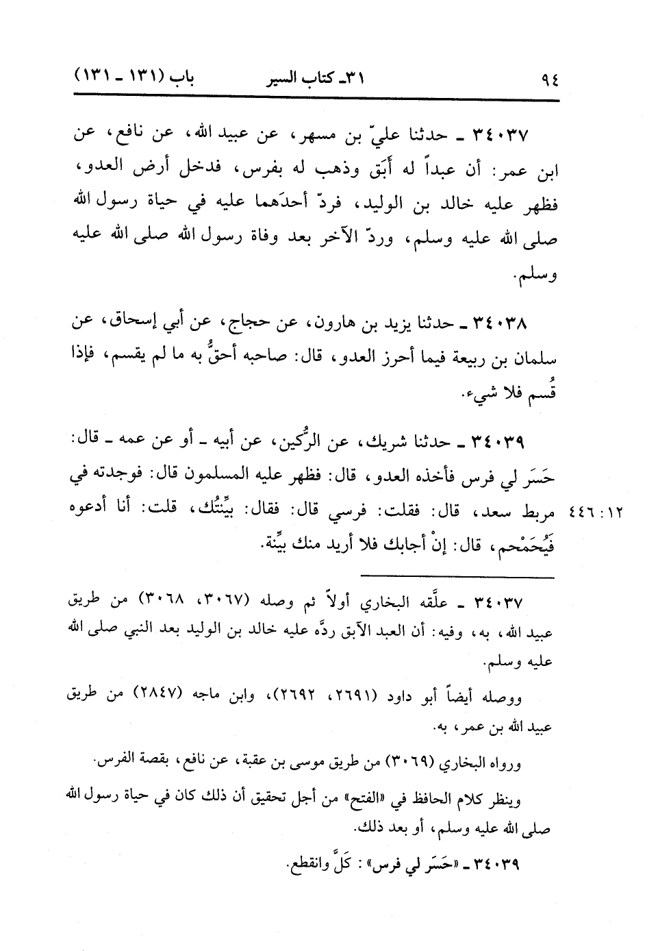 34039- حَدَّثَنَا شَرِيك ، عَنِ الرُّكَيْنِ ، عَنْ أَبِيهِ ، أَوْ عَنْ عَمِّهِ ، قَالَ : حَسَرَ لِي فَرَسٌ فَأَخَذَهُ الْعَدُوُّ ، قَالَ : فَظَهَرَ عَلَيْهِ الْمُسْلِمُونَ ، قَالَ : فَوَجَدْتُهُ فِي مَرْبِطِ سَعْدٍ ، قَالَ : فَقُلْتُ : فَرَسِي ، قَالَ : فَقَالَ : بَيِّنَتُك , قُلْتُ : أَنَا أَدْعُوهُ فَيُحَمْحِمَ ، قَالَ : إِنْ أَجَابَك فَلاَ أُرِيدُ مِنْك بَيِّنَةً. (12/445).