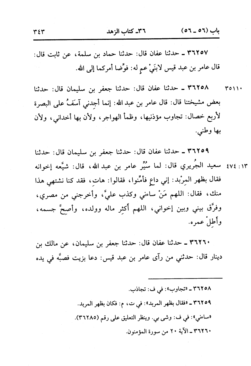 36259- حَدَّثَنَا عَفَّانُ , قَالَ : حدَّثَنَا جَعْفَرُ بْنُ سُلَيْمَانَ ، قَالَ : حَدَّثَنَا سَعِيدُ الْجُرَيْرِيُّ ، قَالَ : لَمَّا سُيِّرَ عَامِرُ بْنُ عَبْدِ اللهِ ، قَالَ : شَيَّعَهُ إخْوَانُهُ ، فَقَالَ : بِظَهْرِ الْمِرْبَدِ : إنِّي دَاعٍ فَأَمِّنُوا ، فَقَالُوا : هَاتِ فَقَدْ كُنَّا نَشْتَهِي هَذَا مِنْك ، فَقَالَ : اللَّهُمَّ مَنْ سَاءَنِي وَكَذَبَ عَلَيَّ وَأَخْرَجَنِي مِنْ مِصْرِي وَفَرَّقَ بَيْنِي وَبَيْنَ إخْوَانِي اللَّهُمَّ أَكْثِرْ مَالَهُ وَوَلَدَهُ وَأَصِحَّ جِسْمَهُ وَأَطِلْ عُمْرَهُ. (13/473)