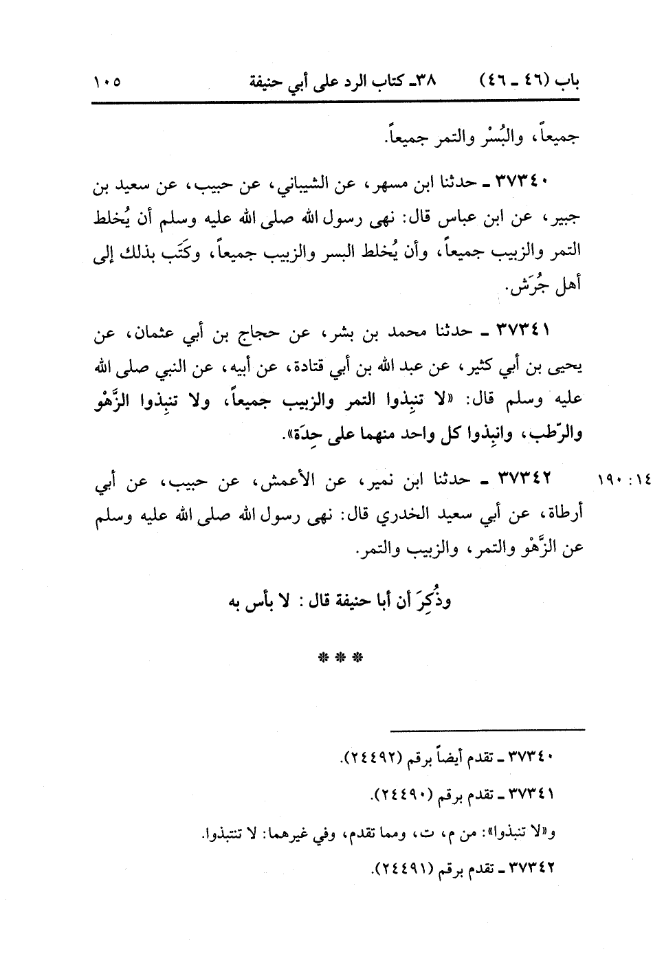 37341- حَدَّثَنَا مُحَمَّدُ بْنُ بِشْرٍ ، عَنْ حَجَّاجِ بْنِ أَبِي عُثْمَانَ ، عَنْ يَحْيَى بْنِ أَبِي كَثِيرٍ ، عَنْ عَبْدِ اللهِ بْنِ أَبِي قَتَادَةَ ، عَنْ أَبِيهِ ، عَنِ النَّبِيِّ صَلَّى الله عَلَيْهِ وَسَلَّمَ ، قَالَ : لاَ تَنْبِذُوا التَّمْرَ وَالزَّبِيبَ جَمِيعًا ، وَلاَ تَنْبِذُوا الزَّهْوَ وَالرُّطَبَ ، وَانْبِذُوا كُلَّ وَاحِدٍ مِنْهُمَا عَلَى حِدَةٍ. (14/189)