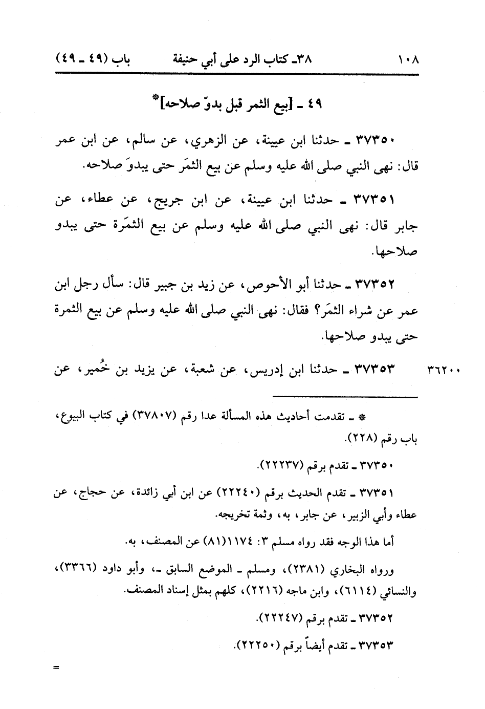 37350- حَدَّثَنَا ابْنُ عُيَيْنَةَ ، عَنِ الزُّهْرِيِّ ، عَنْ سَالِمٍ ، عَنِ ابْنِ عُمَرَ ، قَالَ : نَهَى النَّبِيُّ صَلَّى الله عَلَيْهِ وَسَلَّمَ عَنْ بَيْعِ الثَمَرِ حَتَّى يَبْدُوَ صَلاَحُهُ.