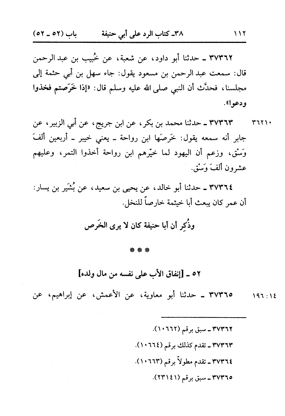 37362- حَدَّثَنَا أَبُو دَاوُدَ ، عَنْ شُعْبَةَ ، عَنْ خُبَيْبِ بْنِ عَبْدِ الرَّحْمَنِ ، قَالَ : سَمِعْتُ عَبْدَ الرَّحْمَنِ بْنَ مَسْعُودٍ ، يَقُولُ : جَاءَ سَهْلُ بْنُ أَبِي حَثْمَةَ إِلَى مَجْلِسَنا ، فَحَدَّثَ أَنَّ النَّبِيَّ صَلَّى الله عَلَيْهِ وَسَلَّمَ ، قَالَ : إِذَا خَرَصْتُمْ ، فَخُذُوا وَدَعُوا.