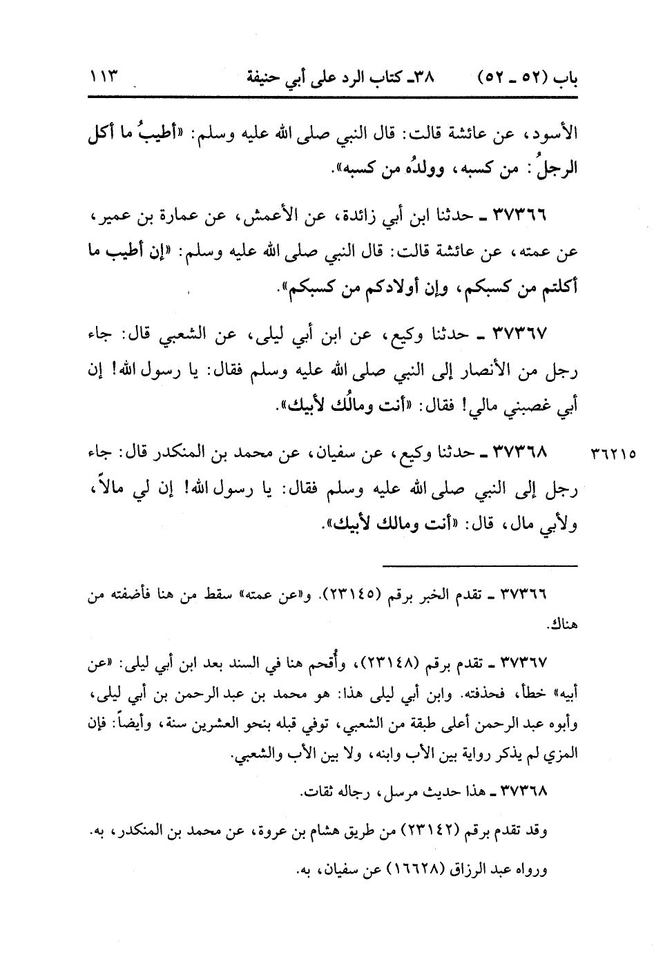 37368- حَدَّثَنَا وَكِيعٌ ، عَنْ سُفْيَانَ ، عَنْ مُحَمَّدِ بْنِ الْمُنْكَدِرِ ، قَالَ : جَاءَ رَجُلٌ إِلَى النَّبِيِّ صَلَّى الله عَلَيْهِ وَسَلَّمَ ، فَقَالَ : يَا رَسُولَ اللهِ ، إِنَّ لِي مَالاً ، وَلأَبِي مَالٌ ، قَالَ : أَنْتَ وَمَالُك لأَبِيكَ. (14/196).