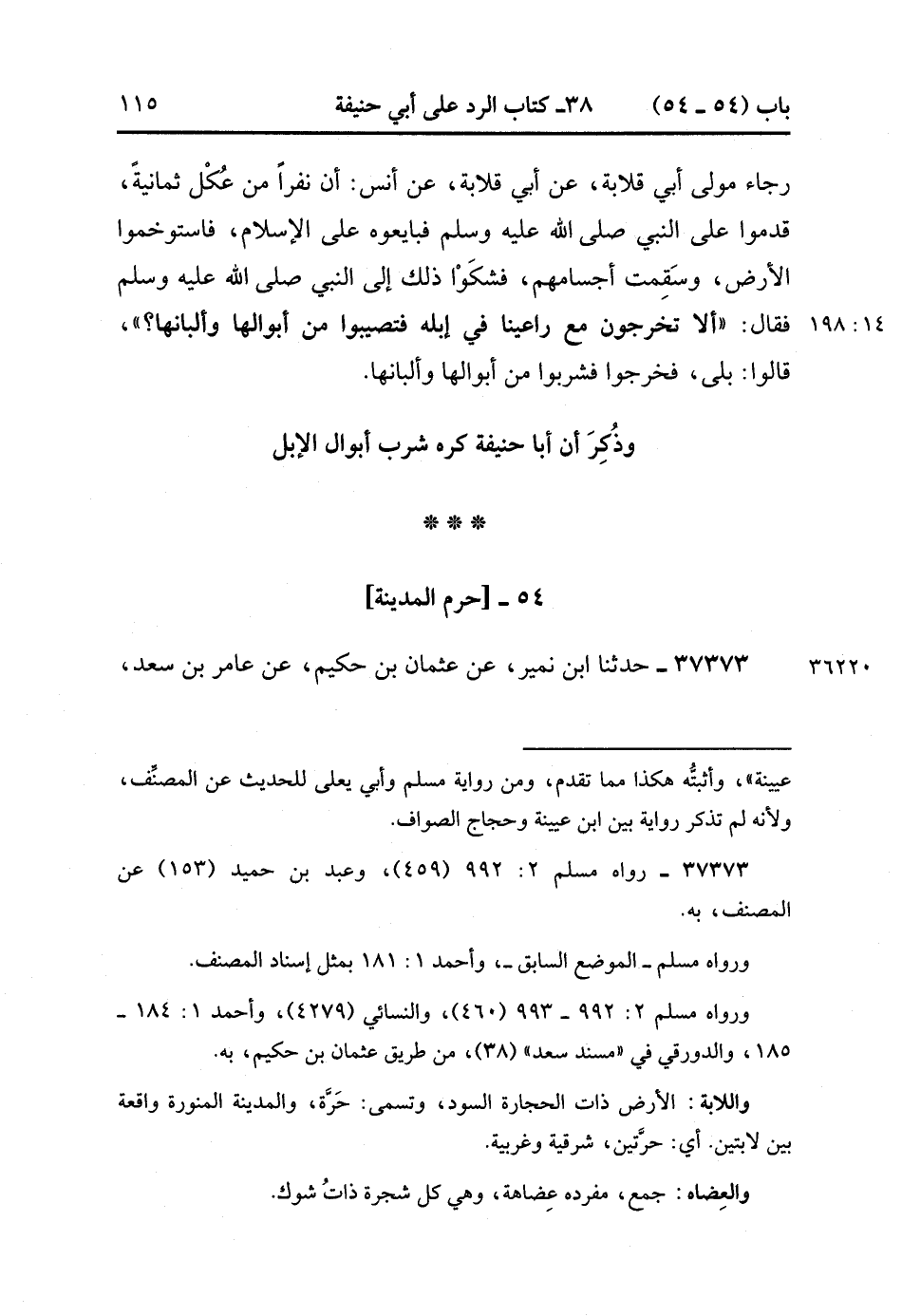37372- حَدَّثَنَا ابْنُ عُلَيَّةَ ، عَنْ حَجَّاجِ بْنِ أَبِي عُثْمَانَ , قَالَ : حدَّثَنَا أَبُو رَجَاءٍ مَوْلَى أَبِي قِلاَبَةَ ، عَنْ أَبِي قِلاَبَةَ ، عَنْ أَنَسٍ ؛ أَنَّ نَفَرًا مِنْ عُكْلٍ ثَمَانِيَةً ، قَدِمُوا عَلَى النَّبِيِّ صَلَّى الله عَلَيْهِ وَسَلَّمَ فَبَايَعُوهُ عَلَى الإِسْلاَمِ ، فَاسْتَوْخَمُوا الأَرْضَ ، وَسَقِمَتْ أَجْسَامُهُمْ ، فَشَكَوْا ذَلِكَ إِلَى النَّبِيِّ صَلَّى الله عَلَيْهِ وَسَلَّمَ ، فَقَالَ : أَلاَ تَخْرُجُونَ مَعَ رَاعِينَا فِي إبِلِهِ فَتُصِيبُوا مِنْ أَبْوَالِهَا وَأَلْبَانِهَا ؟ قَالُوا : بَلَى ، فَخَرَجُوا فَشَرِبُوا مِنْ أَبْوَالِهَا وَأَلْبَانِهَا.