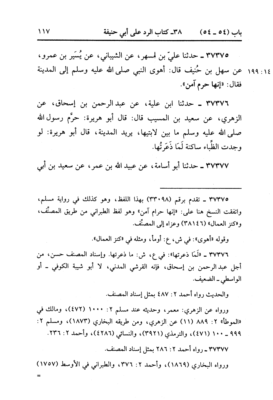 37375- حَدَّثَنَا عَلِيُّ بْنُ مُسْهِرٍ ، عَنِ الشَّيْبَانِيِّ ، عَنْ يُسَيْرِ بْنِ عَمْرٍو ، عَنْ سَهْلِ بْنِ حُنَيْفٍ ، قَالَ : أَهْوَى النَّبِيُّ صَلَّى الله عَلَيْهِ وَسَلَّمَ إِلَى الْمَدِينَةِ ، فَقَالَ : إِنَّهَا حَرَمٌ آمِنٌ. (14/198)