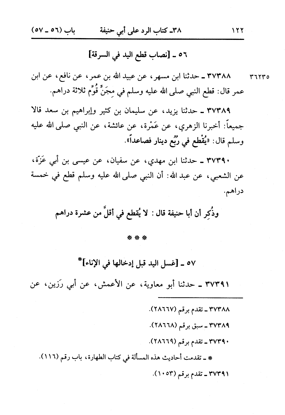 37390- حَدَّثَنَا ابْنُ مَهْدِيٍّ ، عَنْ سُفْيَانَ ، عَنْ عِيسَى بْنِ أَبِي عَزَّةَ ، عَنِ الشَّعْبِيِّ ، عَنْ عَبْدِ اللهِ ؛ أَنَّ النَّبِيَّ صَلَّى الله عَلَيْهِ وَسَلَّمَ قَطَعَ فِي خَمْسَةِ دَرَاهِمَ.